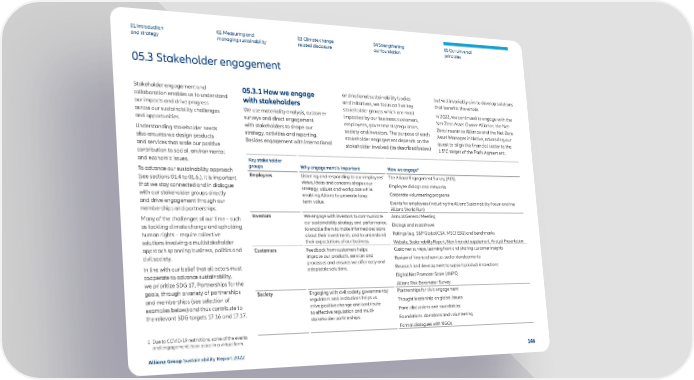 01 Introduction and strategy 02 Measuring and managing sustainability 03 Climate change related disclosure 04 Strengthening our foundation 05 Our universal principles 05.3 Stakeholder engagement Stakeholder engagement and collaboration enables us to understand our impacts and drive progress across our sustainability challenges and opportunities. Understanding stakeholder needs also ensures we design products and services that scale our positive contribution to social, environmental and economic issues. To advance our sustainability approach (see sections 01.4 to 01.6 .), it is important that we stay connected and in dialogue with our stakeholder groups directly and drive engagement through our memberships and partnerships. Many of the challenges of our time – such as tackling climate change and upholding human rights – require collective solutions involving a multistakeholder approach spanning business, politics and civil society. In line with our belief that all actors must cooperate to advance sustainability, we prioritize SDG 17, Partnerships for the goals, through a variety of partnerships and memberships (see selection of examples below) and thus contribute to the relevant SDG targets 17.16 and 17.17. 05.3.1 How we engage with stakeholders We use materiality analysis, customer surveys and direct engagement with stakeholders to shape our strategy, activities and reporting. Besides engagement with international and national sustainability bodies and initiatives, we focus on five key stakeholder groups which are most impacted by our business: customers, employees, governments/regulators, society and investors. The purpose of each stakeholder engagement depends on the stakeholder involved (as described below) but will invariably aim to develop solutions that benefits the whole. In 2022, we continued to engage with the Net-Zero Asset Owner Alliance, the Net- Zero Insurance Alliance and the Net-Zero Asset Manager initiative, advancing our quest to align the financial sector to the 1.5°C target of the Paris Agreement. Key stakeholder groups Why engagement is important How we engage 1 Employees Listening and responding to our employees’ views, ideas and concerns shapes our strategy, values and workplace while enabling Allianz to generate long- term value. The Allianz Engagement Survey (AES) Employee dialogs and networks Corporate volunteering programs Events for employees (including the Allianz Sustainability Forum and the Allianz World Run) Investors We engage with investors to communicate our sustainability strategy and performance, to enable them to make informed decisions about their investments, and to understand their expectations of our business. Annual General Meeting Dialogs and roadshows Ratings (e.g. S&P Global CSA, MSCI ESG) and benchmarks Website, Sustainability Report, Non-financial supplement, Analyst Presentation Customers Feedback from customers helps improve our products, services and processes and ensures we offer easy and adaptable solutions. Customer surveys, learning from and sharing customer insights Review of financial services sector developments Research and development to support product innovations Digital Net Promoter Score (dNPS) Allianz Risk Barometer Survey Society Engaging with civil society, governments/ regulators and institutions helps us drive positive change and contribute to effective regulation and multi- stakeholder partnerships. Partnerships for civic engagement Thought leadership on global issues Panel discussions and roundtables Foundations, donations and volunteering Formal dialogues with NGOs 1 Due to COVID-19 restrictions, some of the events and engagements took place in a virtual form. Allianz Group Sustainability Report 2022 146