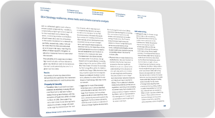 03.4 Strategy resilience, stress tests and climate scenario analysis well as calibrated against each other to ensure overall comparability. In addition, a materiality weighting has been applied for the investment and underwriting areas, considering relative contributions of each asset class and line-of-business to the overall investment or underwriting portfolio, respectively. Lastly, it should be noted that the risks are evaluated on an inherent risk basis, meaning the effect of Allianz-specific mitigation or adaption measures have not been taken into account. 01 Introduction and strategy 02 Measuring and managing sustainability 03 Climate change r elated disclosure 04 Strengthening our f oundation 05 Our universal principles The outcome of this exercise provides a high-level indication of how relevant a given key risk driver and risk transmission channel could potentially become for a given business area. Results A summary of some key observations deriv ed from the qualitative risk assessment are provided below for each business area. Property & Casualty • Transition risks in general have been assessed as relatively more significant over the short-to mid-term horizon versus the long-term horizon, with the exception of legal risks within a limited number of LOBs. One supporting rationale is transitional developments related to climate change will need to be urgently realized over the next 5 to 15 years, which may represent a c omparatively dynamic period of transition risk relevance for the P&C insurance sector, followed afterwards by a period of increasing stabilization. Alternatively, where developments are expected to play out over a longer- term, such as pathways towards full decarbonization, the respective policies and implementation plans will need to be well established over the short- to mid-term. At a more granular level, the assessment also demonstrates the expectation that climate change impacts will be quite diverse in severity, depending on the precise LOB and ESG Risk Transmission Channel. For example, for Technology Risks within the Aviation and Marine-Cargo LOBs alternative fuels may result in a potential net negative impact on claims in the short- to mid- term; whereas for other LOBs the net- impact of technology risks may not be as relevant. • Legal risk: for most of the assessed LOBs there were no drivers identified within the risk transmission channel for Legal Risk. However, for those where applicable drivers were identified, these were consistently assessed as potentially significant. For the commercial Liability LOB this result includes consideration of climate change litigation developments. For the Energy & Construction LOB the assessment f oresees litigation concerning the construction of upstream, mid- stream and downstream renewable energy infrastructure. For Financial Lines, increased legal exposures related to climate change disclosures serves as a potential risk driver. Lastly, looking forward, litigation related to greenwashing is projected to become a potentially relevant risk driver for multiple LOBs. • Physical risks: amongst physical risks, acute physical risks over the short- to mid-term time horizon have been assessed as the most significant. While this result runs counter to the understanding that acute physical risks will only continue to increase in both magnitude and frequency, the presumption is over a longer- term time horizon adaptive measures will help blunt impact severity for Allianz. This includes both adaptive measures by external parties, such as regulations restricting or encouraging movement away from disaster prone areas, as well as mitigation measures by Allianz, such as improvements in the management of insurance risk concentrations and the pricing of insurance coverages. L&H underwriting • LOB-specific risks: for climate-change related risks to L&H underwriting, the assessment did not identify any overall macro conclusions for the business area. Rather, the potential impacts are very much specific to individual LOBs and ESG risk transmission channels. For example, within many of our life and health products, it is anticipated that physical risks will have a detrimental impact on morbidity and mortality rates driven by the effects from heatwaves, vector- borne diseases, drought or flood- induced food and freshwater scarcity, etc. However, the Allianz L&H portfolio is heavily weighted by longevity business which would mean L&H underwriting impacts are expected to be limited in the medium-term. In terms of consumer behavior, any mass movement towards more sustainable lifestyles, including environmentally friendly modes of transportation requiring more physical activity (e.g. biking, walking or public transportation) or nutrition (e.g. reduced meat consumption) is likely to result in positive underwriting impacts. These positive consumer behavior changes are likely to be further enhanced by supporting policy responses, such as the greening Allianz Group Sustainability Report 2022 105