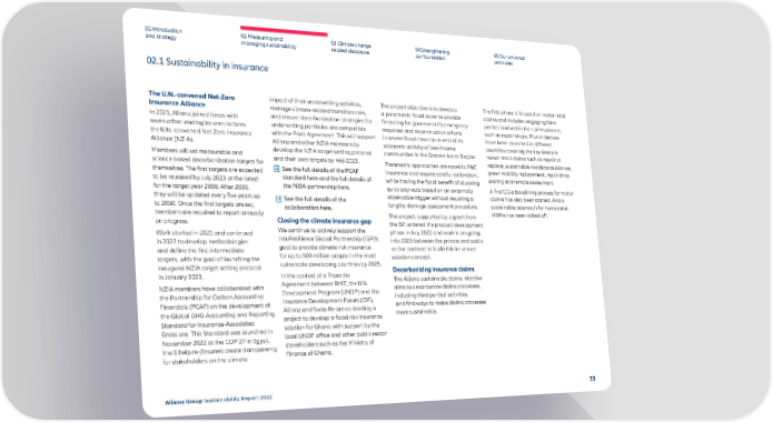 01 Introduction and strategy 02 Measuring and managing sustainability 03 Climate change related disclosure 04 Strengthening our foundation 05 Our universal principles 02.1 Sustainability in insurance The U.N.-convened Net-Zero Insurance Alliance In 2021, Allianz joined forces with seven other leading insurers to form the U.N.-convened Net-Zero Insurance Alliance (NZIA). Members will set measurable and science-based decarbonization targets for themselves. The first targets are expected to b e released by July 2023 at the latest for the target year 2030. After 2030, they will be updated every five years up to 2050. Once the first targets are set, members are required to report annually on progress. Work started in 2021 and continued in 2022 to develop methodologies and define the first intermediate targets, with the goal of launching the inaugural NZIA target-setting protocol in Januar y 2023. NZIA members have collaborated with the Partnership for Carbon Accounting Financials (PCAF) on the development of the Global GHG Accounting and R eporting Standard for Insurance-Associated Emissions. This Standard was launched in November 2022 at the COP 27 in Egypt. It will help re-/insurers create transparency for stakeholders on the climate impact of their underwriting activities, manage climate-related transition risks, and ensure decarbonization strategies for underwriting portfolios are c ompatible with the Paris Agreement. This will support Allianz and other NZIA members to develop the NZIA target setting protocol and their own targets by mid-2023. See the full details of the PCAF standard here and the full details of the NZIA partnership here. See the full details of the collaboration here. Closing the climate insurance gap We continue to actively support the InsuResilience Global Partnership (IGP)’s goal to provide climate risk insurance for up to 500 million people in the most vulnerable developing countries by 2025. In the context of a Tripartite Agreement between BMZ, the U.N. Development Program (UNDP) and the Insuranc e Development Forum (IDF), Allianz and Swiss Re are co-leading a project to develop a flood risk insurance solution for Ghana with support by the local UNDP office and other public sector stakeholders such as the Ministry of Finance of Ghana. The project objective is to develop a parametric flood cover to provide financing for government’ s emer gency response and reconstruction efforts in severe flood cases to re-establish economic activity of low-income communities in the Greater Accra Region. Parametric approaches are novel to P&C insurance and require careful calibration, while having the focal benefit of allowing quick pay- outs based on an externally observable trigger without requiring a lengthy damage assessment procedure. The project, supported by a grant from the ISF, entered the product development phase in July 2022 and work is on-going into 2023 between the private and public sector par tners to build this insur ance solution concept. Decarbonizing insurance claims The Allianz sustainable claims initiative aims to decarbonize claims processes, including third parties’ activities, and find ways to make claims processes more sustainable. The first phase is focused on motor retail claims and includes engaging third parties involved in the claims process, such as repair shops. Pilot initiatives hav e been launched in different countries covering the key levers in motor retail claims such as repair vs replace, sustainable roadside assistance, green mobility replacement, repair shop scoring and remote assessment. A first CO 2 e baselining process for motor claims has also been started. And a sustainable approach for home retail claims has been kicked off. A llianz Gr oup Sustainability R ep or t 2022 33
