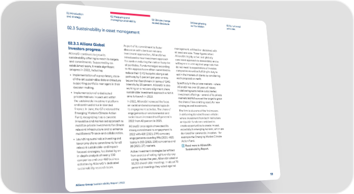 01 Introduction and strategy 02 Measuring and managing sustainability 03 Climate change related disclosure 04 Strengthening our foundation 05 Our universal principles 02.3 Sustainability in asset management 02.3.1 Allianz Global Investors progress AllianzGI continues to grow its sustainability offering to reach its targets and commitments. Supported by an established team, it made significant progress in 2022, including: • Implementation of a proprietary, state- of-the-art sustainable data architecture supporting portfolio managers in their decision making. • Implementation of a dedicated private markets impact unit within the sustainable investment platform and continued drive in blended finance. In June, the G7 endorsed the Emerging Markets Climate Action Fund, recognizing it as a concrete innovative and market-led approach to mobilize private investments for climate relevant infrastructure and to enhance multilateral finance and collaboration. • Launching sustainable investing and taxonomy share commitments for all relevant sustainable- and impact- focused strategies, facilitated by an in-depth analysis of nearly 130 companies and over 460 business activities by AllianzGI’s dedicated sustainability research team. As part of its commitment to foster discussion with clients on net-zero investment approaches, AllianzGI has introduced a new investment approach focused on reducing the carbon footprint of portfolios. Funds managed according to this approach are either committed to reduce their GHG footprint along a set pathway by 5 percent per year or stay below their benchmark in terms of GHG intensity by 20 percent. AllianzGI is also working on a net-zero alignment share sustainable investment approach which it aims to launch in 2023. In 2022, AllianzGI increased the focus on social and environmental topics in its engagement activities. The share of engagements on environmental and social issues increased to 69 percent in 2022 from 42 percent in 2021. AllianzGI once again showcased its strong commitment to engagement in 2022 with 438 (2021: 299) company engagements covering 996 (2021: 482) topics in 355 (2021: 238) companies and 28 (2021: 27) markets. Active investment strategies benefitted from exercise of voting rights and proxy voting. Across the year, AllianzGI voted at 10,205 shareholder meetings. In about 70 percent of meetings they voted against management, withheld or abstained with at least one vote. These figures reflect AllianzGI’s highly active and globally consistent approach to stewardship and a willingness to vote against proposals that do not meet its expectations of investee companies as well as fulfilling its duty to act in the interests of clients by considering each proposal on merit. Specifically in the private markets – where AllianzGI has over 10 years of history in delivering sustainable outcome-led investment offerings – several of its private markets teams have set the target to grow the share of low-emitting assets for new strategies and investments. The firm is also one of the first movers in delivering blended finance vehicles where investment from both institutions and public funds are combined to create opportunities to create impact, especially in emerging markets, which are de-risked for commercial investors – for example the Emerging Market Climate Action Fund. Read more in AllianzGI’s Sustainability Report. Allianz Group Sustainability Report 2022 53