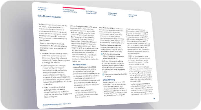 01 Introduction and strategy 02 Measuring and managing sustainability 03 Climate change related disclosure 04 Strengthening our foundation 05 Our universal principles 02.4 Human resources Besides looking at overall results, the AES has become an important source to deep dive into the needs of different employee groups based on, e.g., gender, tenure, age and talent segment clusters, thereby providing insights for focused follow up actions in order to meet group specific needs. Based on the survey result analysis and discussion, the overarching themes for creating impact on engagement in 2023 are: • Implement focused follow up actions on the most relevant engagement dimensions: Recognition & Rewards, Innovation & Change, Top Management & Strategy, and Products. • Continuously evaluate employee engagement by collecting and responding to employee feedback throughout the year within our employee listening strategy; e.g., via quarterly pulse surveys designed to provide additional insights on strategic topics and to strengthen our AES follow- up activities. • Foster co-creation and mutual exchange of best practices by integrating global and local efforts under the umbrella of our ’Engagement Matters’ Program. With our ’Engagement Matters’ Program , introduced in 2022, we connect local and global engagement opportunities under one umbrella across five pillars: 1) Health & Well-being, 2) Strategy & Top Management, 3) Jobs, Processes, Innovation & Change, 4) Learning & Development, 5) Recognition & Reward. As part of the program we launched a central engagement hub and a digital magazine which summarize opportunities and resources, such as listening sessions with board members, mindfulness moments and trainings, mental health talks and podcasts, learning and development opportunities, and benefits beyond pay. AES indices in detail Inclusive Meritocracy Index (IMIX) – measures our progress in building a culture where both people and performance matter, as we seek to enable employees to unlock their full potential. It describes a corporate culture of mutual trust and respect, empowerment, and collaboration where diversity is appreciated, and customer satisfaction is a high priority. The IMIX score comprises ten AES questions around leadership, performance, and corporate culture: 79 percent (2021: 78 %). Work Well Index (WWi+) – measures the stress level of employees for work-related strain, including the topics demands, rewards, control, support, social capital and processes, as well as tool and resource availability. A higher index score is associated with better employee health and productivity: 71 percent (2021: 69 %). Employee Engagement Index (EEI) – measures the degree of satisfaction, loyalty, advocacy, and pride of Allianz employees: 76 percent (2021: 76 %). For further details about the Allianz Engagement Survey results, please see table HR-12. Confirming Allianz’s continued focus on cr eating an engaging and healthy workplace, several operating entities worldwide have been awarded with the Great Place to Work® certification in 2022. Please see the People Fact Book 2022 for details. Ways of Working Amidst the shifts in how we work and do business – how we use technology, where and when we work, what skills we need and more – we have established across Allianz our Ways of Working (WOW). Our WOW standards are centered across five categories: 1) Flexible work and reduced travel, 2) Digital to ols, 3) Health and Well-being, 4) Learning, 5) Organization and Culture. For instance, employees across the globe have the opportunity to spend a minimum of 40 percent of working hours working at home (depending on the position, e.g., mobile worker, office worker, etc.) and – with the introduction of the Cross-Border Remote Work Global Guideline – the opportunity to work up to 25 days a year abroad in accordance with international and local regulations. In 2022, we focused especially on the implementation of a fle xible hybrid work environment. It is our conviction that hybrid is here to stay and is therefore central to the Allianz WOW. In the course of implementing hybrid w orking we, e.g., carried out test pilots and offered special learning opportunities for our employees. To enable our people to work across locations, borders, and time zones, additional tools supporting digital collaboration were added to the digital landscape in 2022. In-office meeting spaces have been equipp ed with technology to support hybrid meetings. In 2022, we also rolled- out a user-friendly and newly developed tool, enabling our employees to check compliance of their cross-border remote Allianz Group Sustainability Report 2022 65