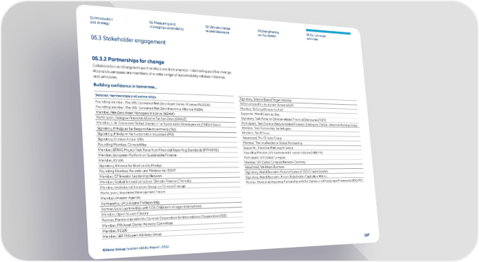 01 Introduction and strategy 02 Measuring and managing sustainability 03 Climate change related disclosure 04 Strengthening our foundation 05 Our universal principles 05.3.2 Partnerships for change Collaboration and long-term partnerships are instrumental in delivering positive change. Allianz’s businesses are members of a wide range of sustainability-related initiatives and principles. Building confidence in tomorrow... Selected memberships and partnerships Founding member, The U.N. Convened Net-Zero Asset Owner Alliance (NZAOA) Founding member, The U.N. Convened Net-Zero Insurance Alliance (NZIA) Member, Net-Zero Asset Managers Initiative (NZAM) Participant, Glasgow Financial Alliance for Net-Zero (GFANZ) Member, U.N. Convened Global Investors for Sustainable Development (GISD) Alliance Signatory, Principles for Responsible Investment (PRI) Signatory, Principles for Sustainable Insurance (PSI) Signatory, Climate Action 100+ Founding Member, ClimateWise Member, EFRAG Project Task Force Non-Financial Reporting Standards (PTF-NFRS) Member, European Platform on Sustainable Finance Member, EV100 Signatory, Finance for Biodiversity Pledge Founding Member, Freunde und Förderer der ESMT Member, G7 Investor Leadership Network Member, Global Innovation Lab on Climate Finance (The Lab) Member, Institutional Investors Group on Climate Change Participant, Insurance Development Forum Member, Investor Agenda Partnership, LMU Allianz Professorship Partner, Local partnership with SOS Children’s Villages International Member, Open Source Climate Partner, Partnership with the German Corporation for International Cooperation (GIZ) Member, PRI Asset Owner Advisory Committee Member, RE100 Member, SBT FI Expert Advisory Group Signatory, Science-Based Target Initiative Stifterverband for deutschen Wissenschaft Member, Stiftung Klimawirtschaft Supporter World Cleanup Day Signatory, Task Force on Climate-related Financial Disclosures (TCFD) Participant, Task Force on Nature-related Financial Disclosure (TNFD) – Informal Working Group Member, Tent Partnership for Refugees Member, The B Team Associated, The Climate Group Member, The InsuResilience Global Partnership Supporter, Transition Pathway Initiative Founding Member, UN Environment Finance Initiative (UNEP FI) Participant, UN Global Compact Member, UN Global Compact Network Germany Associated, We Mean Business Signatory, World Economic Forum Alliance of CEO Climate Leaders Signatory, World Economic Forum Stakeholder Capitalism Metrics Partner, Worldwide Insurance Partnership with the Olympic and Paralympic Movements (IOC/IPC) 05.3 Stakeholder engagement Allianz Group Sustainability Report 2022 147