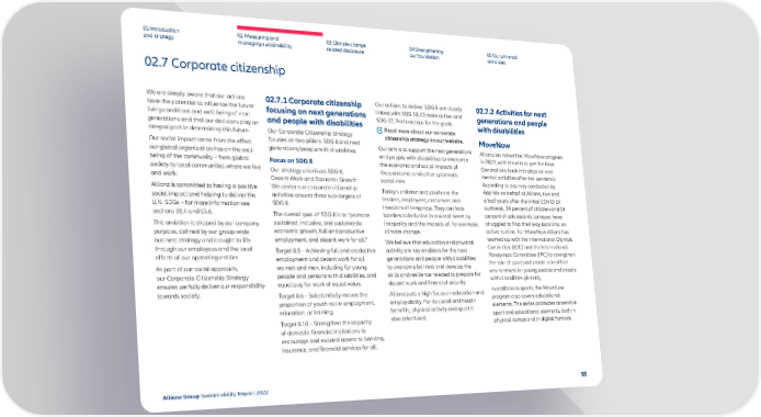 01 Introduction and strategy 02 Measuring and managing sustainability 03 Climate change related disclosure 04 Strengthening our foundation 05 Our universal principles 02.7 Corporate citizenship We are deeply aware that our actions have the potential to influence the future living conditions and well-being of next generations and that our decisions play an integral part in determining this future. Our social impact stems from the effect our global organization has on the well- being of the community – from global society to local communities where we live and work. Allianz is committed to having a positive social impact and helping to deliver the U.N. SDGs – for more information see sections 01.4 and 05.6. This ambition is shaped by our company purpose, defined by our group-wide business strategy and brought to life through our employees and the local efforts of our operating entities. As part of our social approach, our Corporate Citizenship Strategy ensures we fully deliver our responsibility towards society. 02.7.1 Corporate citizenship focusing on next generations and people with disabilities Our Corporate Citizenship Strategy focuses on two pillars: SDG 8 and next generations/people with disabilities. Focus on SDG 8 Our strategy prioritizes SDG 8, Decent Work and Economic Growth. We center our corporate citizenship activities around three sub-targets of SDG 8. The overall goal of SDG 8 is to “promote sustained, inclusive, and sustainable economic growth, full and productive employment, and decent work for all.” Target 8.5 – Achieving full and productive employment and decent work for all women and men, including for young people and persons with disabilities, and equal pay for work of equal value. Target 8.6 – Substantially reduce the proportion of youth not in employment, education, or training. Target 8.10 – Strengthen the capacity of domestic financial institutions to encourage and expand access to banking, insurance, and financial services for all. Our actions to deliver SDG 8 are closely linked with SDG 13, Climate action and SDG 17, Partnerships for the goals. Read more about our corporate citizenship strategy on our website. Our aim is to support the next generations and people with disabilities to overcome the economic and social impacts of the pandemic and other systematic social risks. Today’s children and youth are the leaders, employees, customers and investors of tomorr ow. They can face barriers to inclusion in a world beset by inequality and the impacts of, for example, climate change. We believe that education and physical activity are key enablers for the ne xt generations and people with disabilities to overcome barriers and develop the skills and resilience needed to prepare for decent work and financial security. Allianz puts a high focus on education and employability. For its so cial and health benefits, physical activity and sport is also prioritized. 02.7.2 Activities for next generations and people with disabilities MoveNow Allianz launched the MoveNow program in 2022, with the aim to get the Next Generations back into physical and mental activities after the pandemic. According to a survey conducted by Appinio on behalf of Allianz, two and a half years after the initial COVID 19 outbreak, 39 percent of children and 54 percent of adolescents surveyed have struggled to find their way back into an active routine. For MoveNow Allianz has teamed up with the International Olympic Committee (IOC) and the International Paralympic Committee (IPC) to strengthen the role of sport and create a healthier environment for young people and people with disabilities globally. In addition to sports, the MoveNow program also co vers educational elements. The series promotes accessible sport and educational elements, both in physical camps and in digital formats. Allianz Group Sustainability Report 2022 85