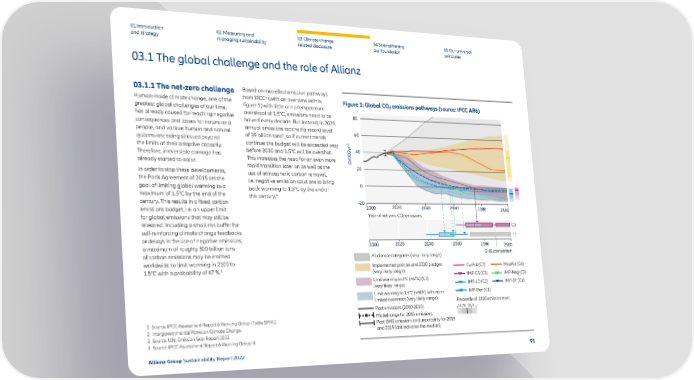01 Introduction and strategy 02 Measuring and managing sustainability 03 Climate change related disclosure 04 Strengthening our foundation 05 Our universal principles 03.1 The global challenge and the role of Allianz 03.1.1 The net-zero challenge Human-made climate change, one of the greatest global challenges of our time, has already caused far-reaching negative consequences and losses for nature and people, and various human and natural systems are being stressed beyond the limits of their adaptive capacity. Therefore, irreversible damage has already started to occur. In order to stop these developments, the Paris Agreement of 2015 set the goal of limiting global warming to a maximum of 1.5°C by the end of the century. This results in a fixed carbon emissions budget, i.e. an upper limit for global emissions that may still be released. Including a small risk buffer for self-reinforcing climate change feedbacks or delays in the use of negative emissions, a maximum of roughly 300 billion tons of carbon emissions may be emitted worldwide to limit warming in 2100 to 1.5°C with a probability of 67 %. 1 Based on modelled emission pathways from IPCC 2 (with an overview within figure 1) with little or no temperature overshoot of 1.5°C, emissions need to be halved every decade. But instead, in 2021, annual emissions reached a record level of 39 billion tons 3 , so if current trends continue the budget will be exceeded way before 2030 and 1.5°C will be overshot. This increases the need for an even more rapid transition later on as well as the use of atmospheric carbon removal, i.e. negative emission solutions to bring back warming to 1.5°C by the end of this century. 4 Figure 1: Global CO 2 emissions pathways (source: IPCC AR6) 1 Source: IPCC Assessment Report 6 Working Group I Table SPM.2. 2 Intergovernmental Panel on Climate Change. 3 Source: U.N. Emission Gap Report 2022. 4 Source: IPCC Assessment Report 6 Working Group III. -20 0 20 40 60 80 GtCO2yr- 1 Year of net-zero CO2 emissions GHG comparison C3 C1 All climate categories (very likely range) Implemented policies and 2030 pledges (very likely range) Limit warning to 2°C (>67%) (C3) (very likely range) Limit warning to 1.5°C (>50%) with no or limited overshoot (very likely range) CurPol (C7) ModAct (C6) IMP-GS (C3) IMP-Neg (C2) Past emissions (2000-2015) Percentile of 2100 emission level: 95 75 25 5 Past GHG emissions and uncertainty for 2015 and 2019 (dot indicates the median) Model range for 2015 emissions 2000 2100 2020 2040 2060 2080 2000 2100 2020 2040 2060 2080 IMP-LD (C1) IMP-Ren (C1) IMP-SP (C1) Allianz Group Sustainability Report 2022 91
