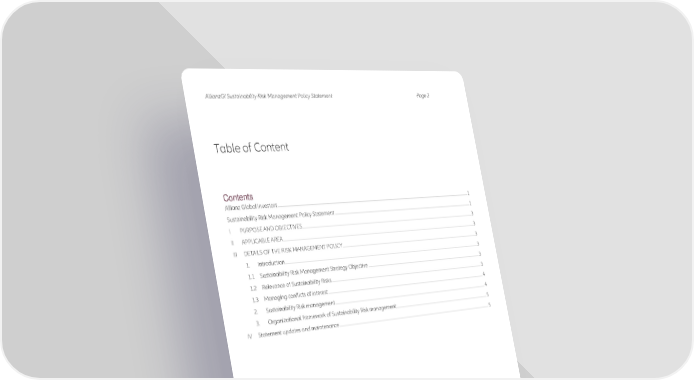 AllianzGI Sustainability Risk Management Policy Statement Page 2 Table of Content Contents Allianz Global Investors ................................ ................................ ................................ ................................ ................................ ................................ ....................... 1 Sustainability Risk Management Policy Statement ................................ ................................ ................................ ................................ ............................. 1 I PURPOSE AND OBJECTIVES ................................ ................................ ................................ ................................ ................................ ................................ .. 3 II APPLICABLE AREA ................................ ................................ ................................ ................................ ................................ ................................ ....................... 3 III DETAILS OF THE RISK MANAGEMENT POLICY ................................ ................................ ................................ ................................ ........................... 3 1. Introduction ................................ ................................ ................................ ................................ ................................ ................................ .......................... 3 1.1 Sustainability Risk Management Strategy Objective ................................ ................................ ................................ ................................ ... 3 1.2 Relevance of Sustainability Risks ................................ ................................ ................................ ................................ ................................ ............. 3 1.3 Managing conflicts of interest ................................ ................................ ................................ ................................ ................................ ................... 4 2. Sustainability Risk management ................................ ................................ ................................ ................................ ................................ .............. 4 3. Organizational framework of Sustainability Risk management ................................ ................................ ................................ ............ 5 IV Statement updates and maintenance ................................ ................................ ................................ ................................ ................................ .............. 5