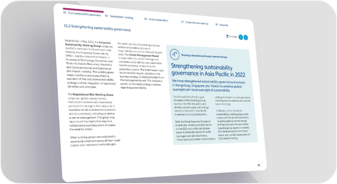 01 Our sustainability approach 02 Sustainable investing 03 Active stewardship 04 Corporate sustainability 05 Appendix 01.2 Strengthening sustainability governance Principles 1 2 Established in May 2022, the Corporate AllianzGI consists of several operational Sustainability Working Group comprises entities and additional lines of two ExCo members for Investments and responsibility exist at the AllianzGI GmbH Shaping sustainable pathways towards change Finance, the Corporate Sustainability level. The GmbH Management Board Officer, and four department heads in is responsible for overall strategy and the areas of Technology, Operations and corporate sustainability and sustainable Strengthening sustainability Products; Human Resources; Marketing investing strategy. It reports to the and Communications; and Sustainable supervisory board. The GmbH supervisory governance in Asia Pacific in 2022 and Impact Investing. The working group board receives regular updates on the meets monthly and ensures effective business strategy of AllianzGI GmbH from execution of the corporate sustainability the management board. This includes a We have strengthened sustainability governance structures strategy and the integration of associated section on the latest strategic updates in Hong Kong, Singapore and Taiwan to combine global initiatives and principles. regarding sustainability. oversight with local oversight of sustainability. The Reputational Risk Working Group The AllianzGI Asia Pacific Legal relating to climate risk and sustainable comprises global representatives Compliance Risk Working Group investing are discussed at semi-annual from across functions who meet twice monitors the ESG risk profile and board meetings. yearly to discuss topics that may pose a climate scenario stress-test findings reputational risk and determine whether related to AllianzGI’s Asia Pacific In Taiwan, a cross-functional action is necessary, including escalation investments on a quarterly basis. sustainability working group works to senior management. The group may closely with the global Sustainable input on ad-hoc topics that require a Both the Hong Kong and Singapore Investing team to monitor trends collaborative sounding board to assess boards also receive quarterly reports and regulations in the sustainable the need for action. on the ESG risk profile and climate investing space, report on material Other working groups are dedicated to scenario stress test results of locally ESG developments to the Taiwan sustainable investment across different asset managed and domiciled funds. board, and coordinate provision of classes and investment methodologies. These reports and other material topics ESG-related training. 20