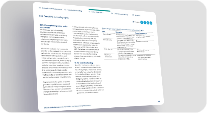 01 Our sustainability approach 02 Sustainable investing 03 Active stewardship 04 Corporate sustainability 05 Appendix 03.7 Exercising our voting rights Principles 5 7 11 12 03.7.2 Strengthening voting policy In 2022, we continued to strengthen our Select changes to our Global Corporate Governance Guidelines in 2022 and process voting policy with respect to sustainability- Issue New policy Reason for the change We review our global corporate related aspects, relating to say on Say on Climate Vote against director in case of low Refining our voting approach governance guidelines and related climate and ethnic diversity (see table). vote turnout and if company is not on Say on Climate policies at least annually, considering This approach reflects our three themes. responsive to investor concerns. changes in market developments, A notable change to our guidelines Ethnic diversity Vote against Chair of Nomination Developments in the US vote turnout, regulatory amendments included the decision to vote against Committee or Chair of the Board if and changes in expectation levels of remuneration policies of companies with board does not have at least one our clients. large market capitalisation in the EU director with an ethnic minority that have no ESG KPIs included as of background (US). We include feedback from our service 2023. We believe management should Ethnic diversity Include ethnic diversity aspect Recommendation of the provider on the applicability of our voting be incentivised to take sustainability into our UK voting policy when Parker Review evaluating director elections. policy in the review process. All proposed aspects into account when making ESG KPIs in Vote against remuneration policies Expectation for companies amendments to the guidelines and strategic business decisions, particularly remuneration without ESG KPIs (EU / large to set proper sustainability- voting policy require consultation with climate change. company) as of 2023. related incentives our investment platform, involving equity portfolio managers in all our locations 03.7.3 Securities lending globally. Input from Investment teams Securities lending can enhance returns enables us to create a nuanced approach where it is deemed appropriate. We do that combines global best practice not actively engage in securities lending standards for corporate governance with on behalf of our mutual funds or assets the knowledge of how these can be best for institutional clients, whether via an applied and promoted in local markets. in-house securities lending desk or a third-party agency. However, where an Amendments to the global corporate individual institutional client requests us governance guidelines are approved to facilitate securities lending through by the Global Proxy Voting Committee. external agency lending – for example The committee considers proposals for via an independently selected custodian – change as raised by the Investment and we strive to support this activity within our Stewardship teams. operational process frameworks. Allianz Global Investors Sustainability and Stewardship Report 2022 88