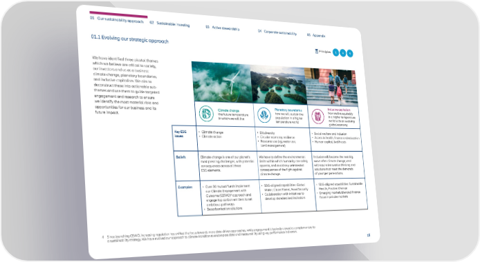 01 Our sustainability approach 02 Sustainable investing 03 Active stewardship 04 Corporate sustainability 05 Appendix 01.1 Evolving our strategic approach Principles 1 4 9 We have identified three pivotal themes which we believe are critical to society, our investors and us as a business: climate change, planetary boundaries, and inclusive capitalism. We aim to deconstruct these into actionable sub- themes and use them to guide targeted engagement and research to ensure we identify the most material risks and Planetary boundaries Inclusive capitalism opportunities for our business and its Climate change how we will sustain the how we live equitably future impact. the future temperature population in a higher in a higher temperature in which we will live temperature world world with an evolving global economy Key ESG • Climate change • Biodiversity • Social welfare and inclusion issues • Climate action • Circular economy, resilience • Access to health, finance and education • Resource use (eg, water use, • Human capital, livelihoods land management) Beliefs Climate change is one of our planet’s We have to define the environmental Inclusion will become the next big most pressing challenges, with potential limits within which humanity can safely wave after climate change, and consequences across all three operate, and avoid any unintended will require innovative thinking and ESG elements. consequences of the fight against solutions that meet the demands climate change. of younger generations. Examples • Over 30 mutual funds implement • SDG-aligned capabilities: Global • SDG-aligned capabilities: Sustainable our Climate Engagement with Water, Clean Planet, Food Security Health, Positive Change 4 Outcome (CEWO) approach and • Collaboration with initiatives to • Emerging markets blended finance engage top carbon emitters to set develop standardised indicators focus in private markets ambitious pathways • Decarbonisation solutions 4 Since launching CEWO, increasing regulation has shifted the focus towards more data-driven approaches, while engagement is typically viewed as complementary to a sustainability strategy. We have evolved our approach to climate transition to encompass data and measurability using key performance indicators. 15