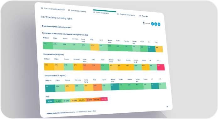 01 Our sustainability approach 02 Sustainable investing 03 Active stewardship 04 Corporate sustainability 05 Appendix 03.7 Exercising our voting rights Principles 7 11 12 Breakdown of proxy voting by location Percentage of resolutions voted against management in 2022 Belgium China France Germany Hong Italy Japan Nether- Spain Sweden Switzer- Taiwan UK USA Kong lands land 16% 21% 21% 22% 29% 32% 24% 11% 14% 11% 20% 15% 4% 36% Compensation (% against) Belgium China France Germany Hong Italy Japan Nether- Spain Sweden Switzer- Taiwan UK USA Kong lands land 44% 37% 23% 47% 56% 51% 12% 36% 48% 46% 23% 43% 20% 78% Director-related (% against) Belgium China France Germany Hong Italy Japan Nether- Spain Sweden Switzer- Taiwan UK USA Kong lands land 8% 28% 33% 20% 36% 56% 27% 8% 17% 12% 17% 26% 4% 29% Key 0–9% 10–19% 20–29% 30–39% 40–49% 50–59% 60–69% 70–79% Allianz Global Investors Sustainability and Stewardship Report 2022 94