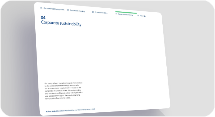 01 Our sustainability approach 02 Sustainable investing 03 Active stewardship 04 Corporate sustainability 05 Appendix 04 Corporate sustainability Our own pathway towards change is characterised by the same commitment to high standards in our operations and supply chain as we ask of the companies in which we invest. We apply scrutiny and conduct due diligence across our organisation and processes to support the sustainable, long- term growth of our clients’ assets. Allianz Global Investors Sustainability and Stewardship Report 2022 99