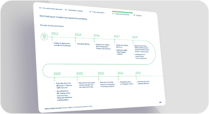 01 Our sustainability approach 02 Sustainable investing 03 Active stewardship 04 Corporate sustainability 05 Appendix 04.2 Creating an inclusive and supportive workplace Ten years of active commitment 2012 2014 2016 2017 2019 • Creation of regional and • First Global I&D Day • Creation of our Flexible • Creation of our Global • Signature of the United local I&D Working Groups Work Arrangements I&D Policy Nations LGBT Standard of Principles and Guidelines • Setting of our 2020 Conduct for Business and of Gender Equality Women in Finance Charter ambitions • Implementation of global Financial Literacy programmes 2020 2022 2022 2022 2022 • Publication of our first • Roll-out of our new global • Publication of our first • First global webinar • Publication of our first I&D guide on “Fostering anti-discrimination and brochure on menopause on transgender identity dedicated I&D Report LGBT+ Inclusion” anti-harassment policy “I’m feeling (really) hot” • Revamping of our I&D strategy around three key pillars: Workplace, Workforce, and Marketplace Allianz Global Investors Sustainability and Stewardship Report 2022 104