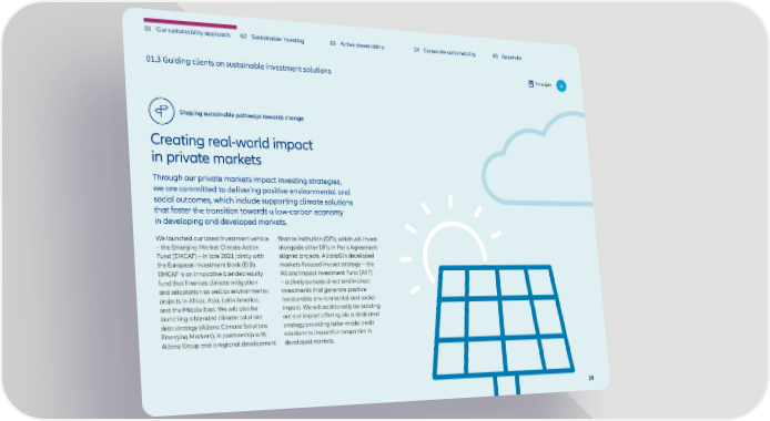 01 Our sustainability approach 02 Sustainable investing 03 Active stewardship 04 Corporate sustainability 05 Appendix 01.3 Guiding clients on sustainable investment solutions Principle 6 Shaping sustainable pathways towards change Creating real-world impact in private markets Through our private markets impact investing strategies, we are committed to delivering positive environmental and social outcomes, which include supporting climate solutions that foster the transition towards a low-carbon economy in developing and developed markets. We launched our latest investment vehicle finance institution (DFI), which will invest –the Emerging Market Climate Action alongside other DFIs in Paris Agreement- Fund (EMCAF) – in late 2021 jointly with aligned projects. AllianzGI’s developed the European Investment Bank (EIB). markets-focused impact strategy – the EMCAF is an innovative blended equity Allianz Impact Investment Fund (AIIF) fund that finances climate mitigation –actively pursues direct and indirect and adaptation as well as environmental investments that generate positive projects in Africa, Asia, Latin America, measurable environmental and social and the Middle East. We will also be impact. We will additionally be building launching a blended climate solutions out our impact offering via a dedicated debt strategy (Allianz Climate Solutions strategy providing tailor-made credit Emerging Markets), in partnership with solutions to impactful companies in Allianz Group and a regional development developed markets. 28