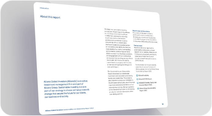 Introduction About this report We began our sustainable investing Report scope and boundaries journey over 20 years ago and published The content of this report relates to our first Responsible Investing Report all AllianzGI activities and locations. in 2018. Our sustainability reporting All measures, activities and figures refer now incorporates our investment to the 2022 fiscal year (1 January 2022 to activities and commitment to active 31 December 2022) unless otherwise stated. stewardship with our stakeholders. We have included an expanded section Find out more on corporate sustainability that features Read more about our approach to more details of our work on embedding sustainability and explore our latest environmental, social and governance research on our website, where you will (ESG) practices in our business operations, find key policy documents and reports, and engagement with our communities including our latest Task Force on and society. Our reporting journey reflects Climate-related Financial Disclosures the broader shift from sustainability (TCFD) Report. commitments to progress, with the onus on demonstrating tangible change and For information on the sustainability real-world impact. commitments and performance of Allianz, please refer to the Allianz Group This Sustainability and Stewardship Sustainability Report 2022. Report showcases our sustainable investment and corporate sustainability AllianzGI website. beliefs and capabilities. The content is AllianzGI TCFD Report. Allianz Global Investors (AllianzGI) is an active also intended to renew our admission to investment management firm and part of the UK Stewardship Code, one of the most AllianzGI Diversity, Equity and Allianz Group. Sustainable investing is a core important external accreditations of our Inclusion Report 2022. part of our strategy to shape pathways towards stewardship activities. Being a signatory of the Stewardship Code is an increasing Allianz Group Sustainability change that secure the future for our clients, priority for institutional investors when Report 2022. our business and society. considering partners. Allianz Global Investors Sustainability and Stewardship Report 2022 02