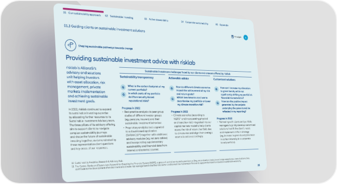 01 Our sustainability approach 02 Sustainable investing 03 Active stewardship 04 Corporate sustainability 05 Appendix 01.3 Guiding clients on sustainable investment solutions Principle 6 Shaping sustainable pathways towards change Providing sustainable investment advice with risklab risklab is AllianzGI’s Sustainable investment challenges faced by our clients and answers offered by risklab advisory and solutions Sustainability transparency Actionable advice Customised solutions unit helping investors with asset allocation, risk management, private What is the carbon footprint of my How do different climate scenarios How can I increase my allocation markets implementation current portfolio? impact the achievement of my risk to green bonds, while not In which parts of my portfolio and return goals? significantly shifting my portfolio’s and achieving sustainable do I face security-based Which benchmarks can I use to financial characteristics? investment goals. reputational risks? decarbonise my portfolio or lower How can the positive impact my climate transition risk? generated by the projects In 2022, risklab continued to expand Progress in 2022 underlying the green bonds be its sustainable investing expertise • Best practice analysis via peer group Progress in 2022 reflected in my reporting? by allocating further resources to its studies of different investor groups • Climate scenarios (according to Sustainable Investment Advisory team. (eg, pensions, insurers) and their NGFS11 and incorporating physical Progress in 2022 The three pillars of its advisory offering sustainable investment behaviour. and transition risk) integrated into our • Partnering with clients and portfolio aim to support clients to navigate • Proprietary analytics tool upgraded capital markets model to help clients managers to jointly develop customised complex sustainability journeys to a cloud-based application assess the risk of return shortfalls due solutions that fit the client’s needs and shape the future of sustainable (SARAH 2.010) together with additional to climate risk and align their strategic and implement shifts in strategy investing together, as demonstrated by advisory modules (eg, net zero advice) asset allocation accordingly. (eg, increase in green bonds/decrease these representative client questions and incorporating supplementary in carbon intensity in a corporate and key areas of our responses. sustainability and financial data from bond portfolio). internal and external sources. 10 Sustainability Analytics, Research & Advisory Hub. 11 The Central Banks and Supervisors Network for Greening the Financial System (NGFS), a group of central banks and supervisors willing, on a voluntary basis, to exchange experiences, share best practices, contribute to the development of environment and climate risk management in the financial sector, and to mobilise mainstream finance to support the transition toward a sustainable economy. 25