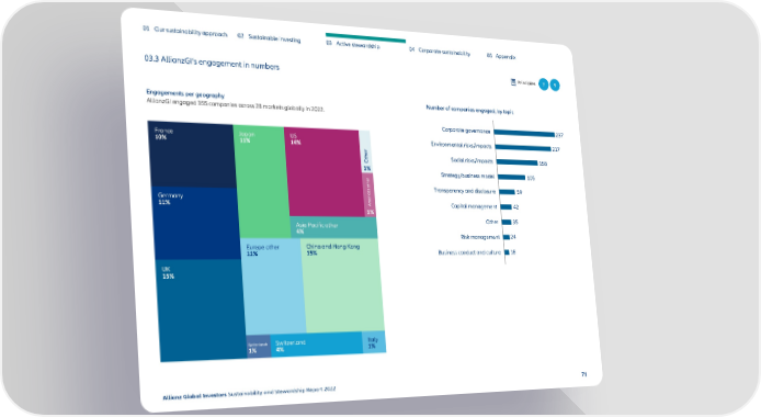 01 Our sustainability approach 02 Sustainable investing 03 Active stewardship 04 Corporate sustainability 05 Appendix 03.3 AllianzGI’s engagement in numbers Principles 7 9 Engagements per geography Number of companies engaged, by topic AllianzGI engaged 355 companies across 28 markets globally in 2022. Corporate governance 237 rance Japan US Environmental risks/impacts 217 10% 11% 14% ther ocial risks/impacts 158 1% trateg/ siness moel 105 as other ransparenc an isclosre 2 59 erany 11% Aeric Capital management 42 1% Asia Pacific other Other 35 4% Risk management 24 Europe other China and Hong Kong 11% 15% siness conct an cltre 18 UK 15% Netherlands Switzerland Italy 1% 4% 1% Allianz Global Investors Sustainability and Stewardship Report 2022 71