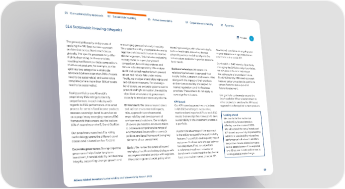 01 Our sustainability approach 02 Sustainable investing 03 Active stewardship 04 Corporate sustainability 05 Appendix 02.6 Sustainable investing categories Principle 7 The general philosophy and process of encouraging greater inclusivity in society. assessing sovereigns with a focus on topics And second, to achieve an ongoing year- applying the SRI Best-in-class approach We assess the ability of corporate issuers to such as healthcare, education, the role on-year improvement against a chosen are identical across listed asset classes organise their internal structure to improve played by women in civil society and the environmental or social KPI. globally. The specific processes may differ risk management. This includes evaluating infrastructure available to provide access to slightly depending on the asset class, management or supervisory board basic needs. Our first KPI is GHG intensity. By actively resulting in different portfolio compositions. composition, board independence and managing the GHG intensity of portfolios, Multi-asset products, for example, can be remuneration transparency. We analyse Business behaviour: We assess the we aim to contribute to help shape split into two categories: sustainable audit and control mechanisms to prevent relationships between issuers and their the pathway to a low emission future. advanced (where more than 70% of assets abuse and reduce risks under review. supply chains, customers and communities The GHG intensity KPI-based approach need to be sustainable) and sustainable Finally, we analyse shareholder rights and along with the impact of their products helps us better understand a portfolio’s complete (where more than 90% of assets anti-takeover measures. For sovereign- and services on society and respect for carbon footprint status quo and need to be sustainable). bond issuers, we evaluate systems used to market regulations and fair business future development. prevent and fight corruption, the stability practices. These criteria do not apply to Equity portfolios use AllianzGI’s of political structures and government sovereign-bond issuers. Our goal is to continuously expand the proprietary ESG ratings to identify capacity to introduce necessary reforms. list of available KPIs and extend them to outperformers in each industry with KPI-based other products. In addition, the KPI-based regards to ESG performance. A tailored Environment: We assess issuers’ direct Our KPI-based approach was rolled out approach is to be applied to more products. process for certain fixed income products and indirect environmental impacts, in Q4 2022 and targets measurable, assesses sovereign-bond issuers based risks, approach to environmental monitored and reported KPIs to track ESG Looking ahead on a proprietary emerging-markets ESG responsibility and development of results that are significant enough to drive We plan to further evolve our framework that screens out the bottom environmental solutions. Our analysis sustainability in the investment process of sustainability-focused product 10% of countries on the E, S and G pillars. of sovereigns assesses measures taken a portfolio. offering over the course of 2023. to address a comprehensive range of We will extend the newly introduced Our proprietary sustainability rating environmental issues with a country’s A potential advantage of the approach KPI-based approach by implementing methodology spans the different asset political and legal framework being key is the ability to quantify the sustainability additional sustainability-related key classes and is based on four factors: elements of our assessment. feature of a portfolio and regularly report performance indicators. In addition, outcomes. It allows us to choose between innovative climate-related concepts Corporate governance: Strong corporate Social: We review the extent of issuers’ two objectives. First, to outperform across asset classes will be explored governance helps foster long-term workplace health and safety, dialogue with a reference investment universe or to address our clients’ preferences to investment, financial stability and business employees and relationships with suppliers. benchmark or a defined threshold on at tackle global climate change. integrity, supporting stronger growth and We consider general social policy when least one environmental or social KPI. Allianz Global Investors Sustainability and Stewardship Report 2022 50