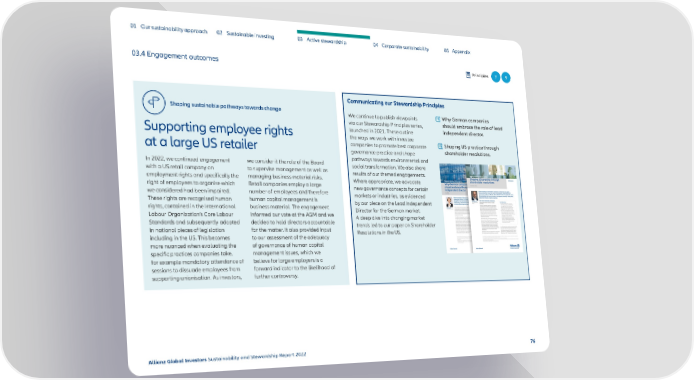 01 Our sustainability approach 02 Sustainable investing 03 Active stewardship 04 Corporate sustainability 05 Appendix 03.4 Engagement outcomes Principles 7 9 Communicating our Stewardship Principles Shaping sustainable pathways towards change We continue to publish viewpoints Why German companies via our Stewardship Principles series, should embrace the role of lead Supporting employee rights launched in 2021. These outline independent director. the ways we work with investee at a large US retailer companies to promote best corporate Shaping US practice through governance practice and shape shareholder resolutions. In 2022, we continued engagement we consider it the role of the Board pathways towards environmental and with a US retail company on to supervise management as well as social transformation. We also share employment rights and specifically the managing business material risks. results of our themed engagements. right of employees to organise which Retail companies employ a large Where appropriate, we advocate we considered had been impaired. number of employees and therefore new governance concepts for certain These rights are recognised human human capital management is markets or industries, as evidenced rights, contained in the International business material. The engagement by our piece on the Lead Independent Labour Organization’s Core Labour informed our vote at the AGM and we Director for the German market. Standards and subsequently adopted decided to hold directors accountable A deep dive into changing market in national pieces of legislation for the matter. It also provided input trends led to our paper on Shareholder including in the US. This becomes to our assessment of the adequacy Resolutions in the US. more nuanced when evaluating the of governance of human capital specific practices companies take, management issues, which we for example mandatory attendance of believe for large employers is a sessions to dissuade employees from forward indicator to the likelihood of supporting unionisation. As investors, further controversy. Allianz Global Investors Sustainability and Stewardship Report 2022 76