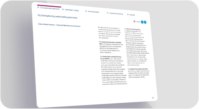 01 Our sustainability approach 02 Sustainable investing 03 Active stewardship 04 Corporate sustainability 05 Appendix 01.2 Strengthening sustainability governance Principles 1 2 Allianz Global Investors – Sustainability Governance Structure The Global Head of Sustainable and The Net Zero Working Group Impact Investing reports to the Global is a dedicated AllianzGI forum Head of Investments, who is a member established in 2022 to oversee key of the ExCo. This anchors sustainable elements of our climate action and impact investing at the top of plan, including methodologies and the organisation. decarbonisation implementation plans in line with the Net Zero Asset The Investment Executive Committee Managers initiative. This working (IEC) is the decision-making body for the group comprises representatives from management of the firm’s investment across functions who meet monthly or platform and has responsibility more frequently to discuss proposals for all sustainability-related topics and implementation plans. The group within investments. evaluates climate-related decarbonisation plans, commitments, methodologies The Sustainable Investing Working and measures such as stewardship Group (SIWG) ensures high-quality and client advisory. The group makes sustainable investing and stewardship recommendations to the SIWG/IEC/ standards are applied and enables ExCo to make final decisions for cross-asset class topics to be considered. governance purposes. The SIWG includes asset class chief investment officers (CIOs) and managers The Global Proxy Voting Committee of the Sustainability Team, who share determines our global voting policy and best practices and discuss and agree handles conflicts of interest. Any major sustainable investing activities to integrate issues or changes are discussed by the sustainability into the investment process. SIWG and reported to the IEC. It also confirms the strategic orientations of our sustainable investment policy such as exclusion policy and stewardship policy. 19