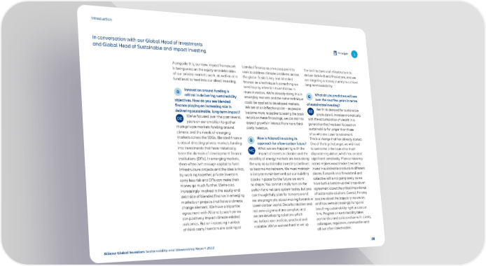 Introduction In conversation with our Global Head of Investments Principle 1 and Global Head of Sustainable and Impact Investing Alongside this, our new impact framework blended finance as an access point to the architecture and infrastructure to is being used on the equity and debt sides seek to address climate problems across deliver Article 8 and 9 solutions, and we of our private markets work, as well as at a the globe. Scale is key and blended are targeting a steady journey to achieve fund level to feed into our direct investing. finance as a technique is something we long-term scalability. need to pay attention to and draw in Innovation around funding is more investors. We’re already doing this in What do you predict we will see critical in delivering sustainability emerging markets and the same technique over the next few years in terms objectives. How do you see blended could be applied to developed markets. of sustainable investing? finance playing an increasing role in We are at an inflection point – as people We think demand for sustainable delivering sustainable, long-term impact? become more receptive to seeing the track products will increase dramatically We’ve focused over the past several record on these financings, we can start to with the accumulation of wealth in a years on our ambition to gather expect growth in interest from more third- generation that has been focused on more private markets funding around party investors. sustainability for longer than those climate and the needs of emerging of us who are closer to retirement. markets across the SDGs. Blended finance How is AllianzGI evolving its This is a change that has already started. is about directing private markets funding approach for a low-carbon future? One of the big challenges we will need into investments that have historically What we see happening with the to overcome is the issue of so much been the domain of development finance impact of events in Ukraine and the disparate regulation, which has created institutions (DFIs). In emerging markets, volatility of energy markets are tests along significant complexity. More consistency there often isn’t enough capital to fund the way as sustainable investing continues across regions would make it easier to infrastructure projects and the idea is that, to become mainstream. We must maintain invest in sustainable products in different by working together, private investors a long-term mindset and put our building places. Europe is on a forward roll and carry less risk and DFIs can make their blocks in place for the future we want collective will is not going away, as we money go much further. We’re also to shape. You cannot simply turn on the have both a bottom-up and a top-down increasingly involved in the equity and switch for a net zero system today, but you agreement about the critical importance debt side of blended finance in emerging can thoughtfully plan for tomorrow and of sustainable solutions. Overall, I’m very markets on projects that have a climate we are pragmatic about moving towards a positive about the trajectory we are on, change element. We have a tripartite lower-carbon world. Decarbonisation and and how we’re increasingly living and agreement with Allianz to see how we net zero alignment are complex, and breathing sustainability right across our can positively impact climate-related we are developing solutions which firm. Progress on sustainability takes outcomes. But an increasing number we believe are credible, practical and partnership and collaboration with clients, of third-party investors are looking at scalable. We’ve worked hard to set up colleagues, regulators, communities and all our other stakeholders. Allianz Global Investors Sustainability and Stewardship Report 2022 08