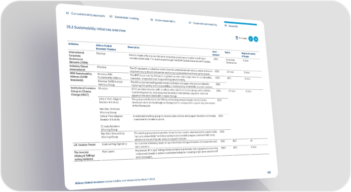 01 Our sustainability approach 02 Sustainable investing 03 Active stewardship 04 Corporate sustainability 05 Appendix 05.3 Sustainability initiatives overview Principles 4 10 Initiative Allianz Global Description Date – Topics Region/location Investors‘ Position present of scope International Member Aims to inspire effective standards of corporate governance to advance efficient 2015 Corporate Global Corporate markets world-wide. This is achieved through the ICGN Global Governance Principles. Governance Governance Network (ICGN) Initiative Climat Member The iCI represents a collective commitment to understand and reduce carbon emissions 2021 Climate Global International of private equity based companies and secure sustainable investment performance. IFRS Sustainability Member IFRS The IFRS Sustainability Alliance is a global membership programme for sustainability 2020 ESG Global Alliance (SASB Sustainability Alliance standards, integrated reporting and integrated thinking. Standards) Member SASB Investor The IAG comprises leading asset owners and asset managers who are committed to 2020 Advisory Group improving the quality and comparability of sustainability-related disclosure to investors. Institutional Investors Member IIGCC provides investors with a collaborative platform to encourage public policies, 2016 Climate Global Group on Climate investment practices, and corporate behaviour that address long-term risks and Change (IIGCC) opportunities associated with climate change. (Under Paris Aligned The group contributes to the PAII by addressing analytical gaps where further 2021 Investor initiative) development of methodologies and approaches is required to support implementation of the Framework. Net Zero Technical Working Group (Under Paris Aligned A dedicated working group to develop best practice and support members to increase 2020 Investor initiative) investment in climate solutions. Climate Solutions Working Group Net Zero Stewardship This working group aims to provide a forum to help investors view how best to operationalise 2021 Working Group “net zero stewardship” and develop key tools to enable progress and work with proxy advisors to ensure they are ready to support investors. UK Investor Forum Underwriting Signatory An investment industry body set up to facilitate dialogue between UK corporates and 2015 ESG UK their investors. The Investor Participant The Investor Mining & Tailings Safety Initiative is an investor led engagement convening 2019 ESG Global Mining & Tailings institutional investors active in extractive industries including major asset owners and Safety Initiative asset managers. Allianz Global Investors Sustainability and Stewardship Report 2022 131