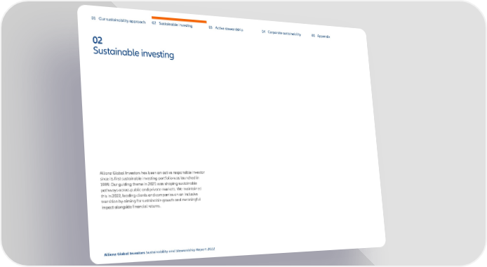 01 Our sustainability approach 02 Sustainable investing 03 Active stewardship 04 Corporate sustainability 05 Appendix 02 Sustainable investing Allianz Global Investors has been an active responsible investor since its first sustainable investing portfolio was launched in 1999. Our guiding theme in 2021 was shaping sustainable pathways across public and private markets. We maintained this in 2022, leading clients and companies on an inclusive transition by aiming for sustainable growth and meaningful impact alongside financial returns. Allianz Global Investors Sustainability and Stewardship Report 2022 3131