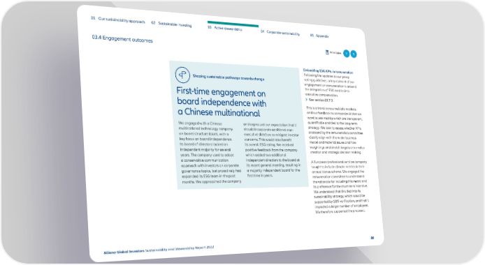 01 Our sustainability approach 02 Sustainable investing 03 Active stewardship 04 Corporate sustainability 05 Appendix 03.4 Engagement outcomes Principles 7 9 Embedding ESG KPIs in remuneration Following the updates to our proxy Shaping sustainable pathways towards change voting guidelines, a key element of our engagement on remuneration is around the integration of ESG metrics into First-time engagement on executive compensation. board independence with See section 03.7.2. This is a trend across multiple markets a Chinese multinational and our feedback to companies is that we want to see metrics which are transparent, We engaged with a Chinese and expressed our expectation that it quantifiable and tied to the long-term multinational technology company should incorporate additional non- strategy. We look to assess whether KPIs on board structure issues, with a executive directors to mitigate investor proposed by the remuneration committee key focus on board independence. concerns. This would also benefit clearly align with the wider business Its board of directors lacked an its overall ESG rating. We received model and material issues and how independent majority for several positive feedback from the company weightings and stretch targets drive value years. The company used to adopt which added two additional creation and strategic decision making. a conservative communication independent directors to the board at A European professional services company approach with investors on corporate its recent general meeting, resulting in sought to include climate metrics in their governance topics, but proactively had a majority independent board for the annual bonus scheme. We engaged the expanded its ESG team in the past first time in years. remuneration committee to understand months. We approached the company the rationale for including this metric and its preference for the short-term incentive. We understood that this tied into its sustainability strategy, which would be supported by SBTi verification, and that it impacted a larger number of employees. We therefore supported the proposal. Allianz Global Investors Sustainability and Stewardship Report 2022 80