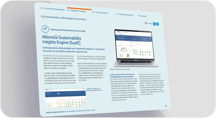 01 Our sustainability approach 02 Sustainable investing 03 Active stewardship 04 Corporate sustainability 05 Appendix 02.3 Sustainability methodologies and analytics Principles 2 4 Shaping sustainable pathways towards change AllianzGI Sustainability Insights Engine (SusIE) Leveraging ESG data enables our investment experts to implement innovative sustainable investment approaches. An effective interface is required to allow our investment experts, product specialists, credible firmwide integration of ESG with risk management and other stakeholders. efficient processing of proprietary models, high democratisation of sustainability SusIE is a key enabler of active investment data and consistent embedding of ESG decisions on sustainability across all asset data in investment processes. classes, feeding all front-office tools with Screenshot of ESG Profile > Scores section consistent ESG data. This contributes In 2022, we launched SusIE to enable to our differentiation, leveraging our ESG-informed investment decision making. expertise via a powerful proprietary A wide range of external ESG datasets SusIE is also the main portal to access The digital platform uses state-of-the-art engine that delivers added value to complemented by in-house research proprietary sustainability scores with technology to facilitate mainstream access our clients. Our multi-provider-based strategy for ESG transparent and granular indicators. to a range of ESG data in one place for all data ensures that we benefit from a broad In 2023, SusIE will also distribute in-house spectrum of data inputs. SusIE processes, research – thematic, sector and company computes and transforms data from research – from our sustainability research Screenshot of ESG Profile > more than 10 third-party vendors into and stewardship analysts. External and Dashboard at company level standardised datasets using cloud data internal insights contribute to the real storage. This includes automated checks integration of sustainability in our active of pre- and post-data processing to ensure investment decisions. high quality standards and data integrity across the value chain. Allianz Global Investors Sustainability and Stewardship Report 2022 41