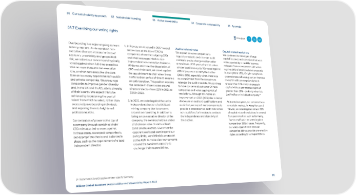 01 Our sustainability approach 02 Sustainable investing 03 Active stewardship 04 Corporate sustainability 05 Appendix 03.7 Exercising our voting rights Principles 7 11 12 Overboarding is a major ongoing concern 1. In France, we observed in 2022 several Auditor-related votes Capital-related resolutions in many markets. As demands on non- successions at the top of CAC40 We expect investee companies to We continued to vote against large executive directors increase in times of companies where the outgoing CEO regularly evaluate and retender audit capital issuance authorisations that were economic uncertainty and geopolitical and chair was appointed as non- contracts and to change auditors after not supported by a credible business risk, we voiced our concerns and typically independent non-executive chairman. a maximum of 20 years of service unless rationale from management. We voted voted against when full-time executives While we welcome the dissociation of stricter local laws apply. We voted against against 16% of capital-related proposals take on more than one non-executive CEO and chair roles, we voted against 28% of proposals to ratify the auditor in 2022 (2021: 15%). Only in exceptional role, or when non-executive directors the appointment as chair when it was (2021: 26%), especially when there was circumstances will we support an increase take on too many appointments in public not for a short period of time to ensure a no commitment from the company to in capital with pre-emption rights of and private companies. We encourage smooth transition. This position explains retender the audit mandate. We continue greater than 33% and an increase in companies to improve gender diversity the increase in dissent votes around to have concerns about some Chinese capital without pre-emption rights of and, in the UK and the US, ethnic diversity directors’ election from 22% in 2021 to companies and voted against 46% of greater than 10% – and only when it is 14 of their boards. We expect this to be 33% in 2022. resolutions. Although this marks an justified by an individual company. achieved by broadening the pool of improvement on 2021 (60%) due to better talent from which to select, rather than 2. In 2022, we voted against the senior disclosure on auditors’ qualifications and As in previous years, our concerns focus excessively overboarding individuals independent director of a UK-listed audit fees, we expect more companies to on certain markets. In Hong Kong and and exposing them to heightened mining company due to concerns provide a breakdown of audit fees versus Taiwan, we voted against almost 30% professional risks. around overboarding. In addition to non-audit fees for investors to evaluate of capital-related resolutions. In several being a non-executive director at the the independence and objectivity of European markets such as Germany, Concentration of power at the top of company, the nominee held a number the auditor. France and Spain, we voted against a company through combined chair/ of chairman roles at various listed in more than 30% of cases. Frequently, CEO roles also led to votes against. (and private) entities. Given that the our votes against were because In these cases, we expect companies to apparent workload went beyond our companies did not provide pre-emption put appropriate checks and balances in policy limits, we withheld our support rights according to our expectations. place, such as the appointment of a lead at the AGM to make clear our concerns independent director. around the nominee’s capacity to discharge their responsibilities. 14 Note that AllianzGI applies stricter rules for Germany. Allianz Global Investors Sustainability and Stewardship Report 2022 91