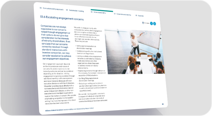 01 Our sustainability approach 02 Sustainable investing 03 Active stewardship 04 Corporate sustainability 05 Appendix 03.6 Escalating engagement concerns Principles 7 11 Companies are not always We prefer to engage directly with responsive to our concerns companies but, where direct engagement raised through engagement or does not progress satisfactorily or their actions do not give due where our shareholding is insufficient for an effective escalation in our consideration to the interests own right, we consider other options. of minority shareholders. If we These may include: conclude that our concerns • Voting against resolutions at cannot be resolved through shareholder meetings. standard interactions with • Collaborating with other institutional investee companies, we may investors on single issues. consider escalation to achieve • Joining a collaborative engagement our engagement objectives. initiative co-ordinated by investors, trade associations and other Our engagement approach depends organisations where these seek on the circumstances and nature of to address market or industry- concerns. Escalation options are not wide concerns. mutually exclusive and can be combined • Expressing concerns through advisers to depending on the situation. Initially, the company, for example in merger and engagement is typically escalated through acquisition (M&A) situations. additional meetings with management • Co-filing/filing resolutions at and more intensive dialogue with non- shareholder meetings. executive directors or with the chairperson. • Reducing or exiting our investment We prefer to address issues directly with a position when appropriate (any decision non-executive board chairperson, lead or to exit an investment position is taken at senior independent director, or other non- a portfolio level). executive board members to gain senior input on the matters of concern. We consider We consider making public statements emphasising our position to the board in in respect of individual companies as a writing if we have the impression that direct last resort when all other channels of interaction has been unsuccessful. constructive dialogue have been exhausted. Allianz Global Investors Sustainability and Stewardship Report 2022 84