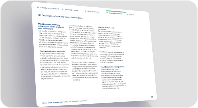01 Our sustainability approach 02 Sustainable investing 03 Active stewardship 04 Corporate sustainability 05 Appendix 04.2 Creating an inclusive and supportive workplace 04.2.2 Promoting health and Our framework allows for flexibility in Supporting employee health wellbeing in a flexible and hybrid both time and place, providing room for and wellbeing work environment individual work set-ups for the benefit of The health and wellbeing of our employees “We care for tomorrow” is our employee a thriving culture. Some may agree within is a top priority. Our holistic approach value proposition – a promise that we their team to come in on fixed days while incorporates mental, social and physical make to our current and future employees. others choose to split their time between wellbeing. We consider the causes of stress Our aim is to be the preferred inclusive morning hours in the office and work from and depression through an intersectional home for our industry’s best talent. home in the afternoon. This flexible model DEI lens to promote good mental health We strive to provide a caring and inclusive empowers our colleagues to balance and offer advice on topics such as work environment where employees have work, career development and personal nutrition, sleep and managing work- the support they need to succeed. priorities in the way that best suits their life balance. individual work and life situation. In 2022, Creating a flexible work environment the framework for flexible working was Our efforts to support employee wellbeing As a global business, we have many updated to formally include the option for are paying off with a four percentage point years of experience using technology- eligible roles to work from another country increase to 74% favourable responses enabled virtual collaboration. Our global up to 25 days per calendar year. for the AES question: “Our company framework for flexible work arrangements sufficiently looks after the wellbeing and has been in place since 2016. With the The results of the Allianz Engagement health of its employees”. development of new tools and equipment Survey (AES) show that flexible work is a to support digital collaboration and the strong driver for employee engagement 04.2.3 Encouraging lifelong learning deep experience gained over the past with an 83% favourable score for the We recognise that learning and few years, we continue to build on this question: “Our company offers flexible development is a key differentiator framework. Our focus is on empowering work opportunities that meet my current in the financial services industry, employees with collaborative and flexible needs with regard to where and when I and contributes to long-term business ways of working. perform my tasks” (+1 percentage point success. Performance management from 2021). and transparent feedback informs regular development dialogues, and employees are provided access to global, regional and local development offers for lifelong continuous learning. Allianz Global Investors Sustainability and Stewardship Report 2022 108