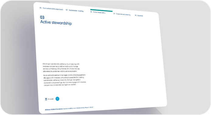 01 Our sustainability approach 02 Sustainable investing 03 Active stewardship 04 Corporate sustainability 05 Appendix 03 Active stewardship We shape sustainable pathways by engaging with investee companies to deliver real-world change across our three guiding themes of climate change, planetary boundaries and inclusive capitalism. As an active investment manager, constructive engagement dialogue with investee companies is essential for creating sustainable pathways towards change. Our global stewardship approach guides how we engage with investee companies and exercise our rights as owners. Principle 7 Allianz Global Investors Sustainability and Stewardship Report 2022 61