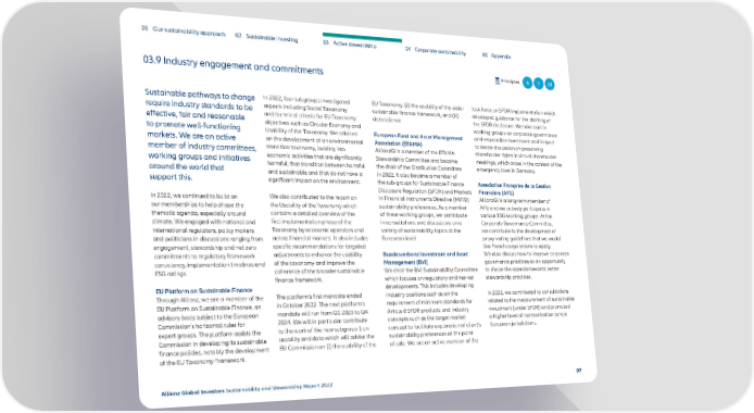 01 Our sustainability approach 02 Sustainable investing 03 Active stewardship 04 Corporate sustainability 05 Appendix 03.9 Industry engagement and commitments Principles 4 7 10 Sustainable pathways to change In 2022, four subgroups investigated EU Taxonomy, (ii) the usability of the wider task force on SFDR implementation which require industry standards to be aspects including Social Taxonomy sustainable finance framework, and (iii) developed guidance for the drafting of effective, fair and reasonable and technical criteria for EU Taxonomy data science. the SFDR disclosure. We take part in to promote well-functioning objectives such as Circular Economy and working groups on corporate governance Usability of the Taxonomy. We advised European Fund and Asset Management and responsible investment and helped markets. We are an active on the development of an environmental Association (EFAMA) to shape discussion on preserving member of industry committees, transition taxonomy, looking into AllianzGI is a member of the EFAMA shareholder rights in virtual shareholder working groups and initiatives economic activities that are significantly Stewardship Committee and became meetings, which arose in the context of the around the world that harmful, that transition between harmful the chair of the Distribution Committee emergency laws in Germany. and sustainable and that do not have a in 2022. It also became a member of support this. significant impact on the environment. the sub-groups for Sustainable Finance Association Française de la Gestion Disclosure Regulation (SFDR) and Markets Financière (AFG) In 2022, we continued to build on We also contributed to the report on in Financial Instruments Directive (MiFID) AllianzGI is a long-term member of our memberships to help shape the the Usability of the Taxonomy which sustainability preferences. As a member AFG and we actively participate in thematic agenda, especially around contains a detailed overview of the of these working groups, we participate various ESG working groups. At the climate. We engaged with national and first implementation phase of the in consultations and discussions on a Corporate Governance Committee, international regulators, policy makers Taxonomy by economic operators and variety of sustainability topics at the we contribute to the development of and politicians in discussions ranging from across financial markets. It also includes European level. proxy-voting guidelines that we would engagement, stewardship and net zero specific recommendations for targeted like French corporations to apply. commitments to regulatory framework adjustments to enhance the usability Bundesverband Investment and Asset We also discuss how to improve corporate consistency, implementation timelines and of the taxonomy and improve the Management (BVI) governance practices as an opportunity ESG ratings. coherence of the broader sustainable We chair the BVI Sustainability Committee to shape the agenda towards better finance framework. which focuses on regulatory and market stewardship practices. EU Platform on Sustainable Finance developments. This includes developing Through Allianz, we are a member of the The platform’s first mandate ended industry positions such as on the In 2022, we contributed to consultations EU Platform on Sustainable Finance, an in October 2022. The next platform’s requirement of minimum standards for related to the measurement of sustainable advisory body subject to the European mandate will run from Q1 2023 to Q4 Article 8 SFDR products and industry investment (under SFDR) and promoted Commission’s horizontal rules for 2024. We will in particular contribute concepts such as the target market a higher level of harmonisation across expert groups. The platform assists the to the work of the new subgroup 1 on concept to facilitate exploration of client’s European jurisdictions. Commission in developing its sustainable usability and data which will advise the sustainability preferences at the point finance policies, notably the development EU Commission on (i) the usability of the of sale. We are an active member of the of the EU Taxonomy Framework. Allianz Global Investors Sustainability and Stewardship Report 2022 97