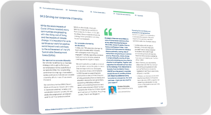 01 Our sustainability approach 02 Sustainable investing 03 Active stewardship 04 Corporate sustainability 05 Appendix 04.5 Driving our corporate citizenship While the acute impacts of SDG 8 are also closely linked with Promoting financial literacy and Covid-19 have receded, many SDG 13, Climate Action and SDG 17, education for next generations communities are grappling Partnerships for the Goals. In line with Our aim is to support future generations with the rising cost of living the Allianz Group corporate citizenship to overcome the economic and social strategy, future generations are a key At present, there are more children in impacts of the pandemic and other and the impacts of climate focus of our approach. need of humanitarian assistance than systematic social risks. Examples include: change. It is important for us to at any other time since the Second continue our work for positive Our corporate volunteering World War. Across the globe, they are • In collaboration with IW Junior in social impact and contribute and donations facing a confluence of crises – from Germany, 15 AllianzGI employees In 2022, over 700 corporate volunteering violence and displacement to infectious provided financial literacy education to the achievement of the UN hours were recorded within AllianzGI, disease outbreaks, soaring rates of for students nationwide through Sustainable Development with colleagues around the globe malnutrition and growing up in extreme online training and school class visits. Goals (SDGs). engaged in actively supporting numerous poverty. Meanwhile, climate change More than 300 corporate volunteering local community initiatives aimed at is compounding the severity of these hours were contributed by our Frankfurt Our approach to corporate citizenship creating positive long-term impact. crises and unleashing new ones. But the office in 2022. Our ambition is defined by our business situation is not hopeless. Together with • Also in Germany, our long-standing strategy and brought to life through We continued with our tradition of end-of- supporters like AllianzGI we have risen collaboration with “BVI Hoch im Kurs” our employees and the local efforts of year donations across the globe to causes to the challenge. From Afghanistan to is educating young people on topics our global entities. Our longstanding that are important to our employees. Somalia, from the Sahel to Yemen – such as “the financial crisis and its commitment to shaping a more resilient Our donations of around EUR 620,000 UNICEF is on the ground in countries implications” and “How to save money society continues to motivate our corporate in 2022 focused on supporting local around the world, providing children efficiently” since 2008. citizenship efforts in our offices around communities to deal with the rising cost with lifesaving assistance during • In Taiwan, our employees worked with the world. of living, promoting financial literacy and humanitarian emergencies. Our work Help Rainbow Family Life Education education among the next generations, continues – thank you very much for Association since 2020 to organise and Our activities prioritise SDG 8, Decent supporting child safety and basic your support!” create financial education courses. Work and Economic Growth, which aims needs, and protecting the environment. A total of 546 students took part in the to “promote sustained, inclusive, and Beneficiaries included UNICEF for their Christian Schneider, courses in 2022. sustainable economic growth, full and Humanitarian Action for Children appeal CEO of UNICEF Germany productive employment, and decent and food banks in Frankfurt, Hong Kong, © UNICEF/UN0606725/Etges work for all.” Our actions to deliver London, Munich and Singapore. Allianz Global Investors Sustainability and Stewardship Report 2022 119