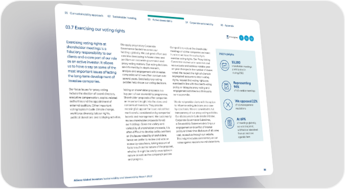 01 Our sustainability approach 02 Sustainable investing 03 Active stewardship 04 Corporate sustainability 05 Appendix 03.7 Exercising our voting rights Principles 7 11 12 Exercising voting rights at We apply proprietary Corporate Our goal is to vote at the shareholder shareholder meetings is a Governance Guidelines across our meetings of all the companies we invest 2022 highlights fiduciary responsibility to our holdings globally. We put great effort and in, where we have the authority to clients and a core part of our role care into developing in-house views and exercise voting rights. Our Proxy Voting 10,200 positions on corporate governance and Committee reviews vote outcomes and shareholder meetings as an active investor. It allows proxy voting matters. Our voting decisions we evaluate and address notable year- participated in us to have a say on some of the are informed by in-depth research, on-year changes in the number of shares during 2022 most important issues affecting analysis and engagement with investee voted. We respect the right of clients in the long-term development of companies which we often conduct over segregated accounts to retain voting several years. Detailed proxy voting rights, request that voting rights are Representing investee companies. policies help shape our voting decisions. exercised in line with the client’s voting 94% policy, or delegate proxy voting and of all votable meetings Our focus issues for proxy voting Voting on shareholder proposals is a engagement activities to a third-party include the election of board directors, key part of our stewardship programme. service provider. executive compensation, capital-related Shareholder proposals offer companies We opposed 22% authorities and the appointment of an important insight into the views and We do not provide clients with the option external auditors. Other important concerns of investors. They provide to influence voting decisions on a case- of all management voting topics include climate change, meaningful support for issues raised that by-case basis. We are committed to full resolutions workforce diversity, labour rights, merit careful consideration by companies’ transparency of our proxy-voting activities. political donations and lobbying activities. boards and management. We customarily Our disclosures include detailed Global At 69% review shareholder proposals for all Corporate Governance Guidelines, our holdings. Given the variety and a Stewardship Statement detailing our of meetings globally, variability of shareholder proposals, it is engagement and conflict of interest we voted against, often difficult to develop policy positions policy and real-time disclosure of all votes withheld or abstained on the issues raised by shareholders; cast, accessible through our website. from at least one hence we prefer to review and vote on This insight includes commentary on our agenda item a case-by-case basis, taking account of votes against resolutions and abstentions. factors such as the nature of the proposal, whether it might be overly prescriptive in nature as well as the company’s policies and progress. Allianz Global Investors Sustainability and Stewardship Report 2022 86