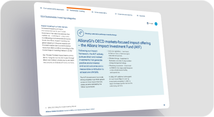 01 Our sustainability approach 02 Sustainable investing 03 Active stewardship 04 Corporate sustainability 05 Appendix 02.6 Sustainable investing categories Principle 7 Impact investing in private markets Increased frequency of major environmental events and social Shaping sustainable pathways towards change movements has raised awareness that capital can – and should – play a role in addressing environmental and social AllianzGI’s OECD markets-focused impact offering issues. As a field, impact investing has grown steadily in the past decade with –the Allianz Impact Investment Fund (AIIF) the total market size now estimated at more than USD 1.1 trillion according to the Global Impact Investing Network (GIIN).6 Following our impact • Inclusive capitalism – investment framework, the AIIF actively in Karriere Tutor, a German digital Our Private Markets Impact teams aim to pursues direct and indirect educational business. deliver tangible real-world impact through investments that generate • Climate change – investment in direct and indirect private equity and debt Hydrostor, provider of long-duration investments and blended finance vehicles. positive environmental energy storage technology. and social outcomes and a • Planetary boundaries – investment measurable contribution to in REBIKE, first large-scale European e-bike refurbishment facility at least one UN SDG. and operations. The AIIF’s investments have made In 2022, AIIF published its inaugural strong progress on portfolio growth Annual Impact Report covering across all three impact thematic investments completed in 2021 to areas, as demonstrated by the report the impact performance of its following examples: underlying portfolio. 6 GIIN, 2022 Sizing the Impact Investing Market. Allianz Global Investors Sustainability and Stewardship Report 2022 55
