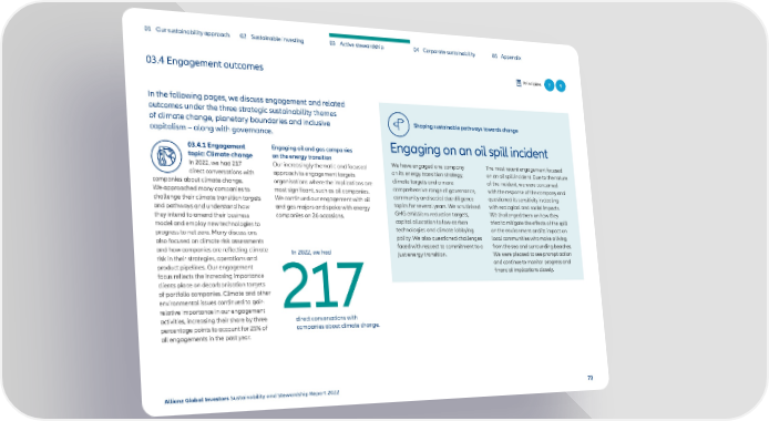 01 Our sustainability approach 02 Sustainable investing 03 Active stewardship 04 Corporate sustainability 05 Appendix 03.4 Engagement outcomes Principles 7 9 In the following pages, we discuss engagement and related outcomes under the three strategic sustainability themes of climate change, planetary boundaries and inclusive Shaping sustainable pathways towards change capitalism – along with governance. 03.4.1 Engagement Engaging oil and gas companies Engaging on an oil spill incident topic: Climate change on the energy transition We have engaged one company The most recent engagement focused In 2022, we had 217 Our increasingly thematic and focused on its energy transition strategy, on an oil spill incident. Due to the nature direct conversations with approach to engagement targets climate targets and a more of the incident, we were concerned companies about climate change. organisations where the implications are comprehensive range of governance, with the response of the company and We approached many companies to most significant, such as oil companies. community and social due diligence questioned its sensitivity in dealing challenge their climate transition targets We continued our engagement with oil topics for several years. We scrutinised with ecological and social impacts. and pathways and understand how and gas majors and spoke with energy GHG emissions reduction targets, We challenged them on how they they intend to amend their business companies on 26 occasions. capital allocation to low-carbon tried to mitigate the effects of the spill model and employ new technologies to technologies and climate lobbying on the environment and its impact on progress to net zero. Many discussions policy. We also questioned challenges local communities who make a living also focused on climate risk assessments faced with respect to commitment to a from the sea and surrounding beaches. and how companies are reflecting climate In 2022, we had just energy transition. We were pleased to see prompt action risk in their strategies, operations and and continue to monitor progress and product pipelines. Our engagement financial implications closely. focus reflects the increasing importance clients place on decarbonisation targets of portfolio companies. Climate and other environmental issues continued to gain 217 relative importance in our engagement activities, increasing their share by three direct conversations with percentage points to account for 25% of companies about climate change. all engagements in the past year. Allianz Global Investors Sustainability and Stewardship Report 2022 72