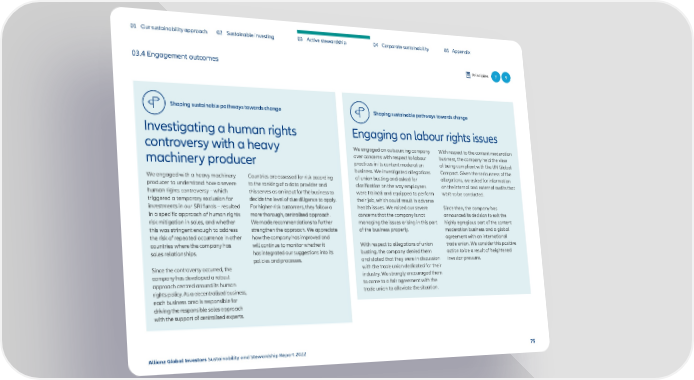 01 Our sustainability approach 02 Sustainable investing 03 Active stewardship 04 Corporate sustainability 05 Appendix 03.4 Engagement outcomes Principles 7 9 Shaping sustainable pathways towards change Shaping sustainable pathways towards change Investigating a human rights Engaging on labour rights issues controversy with a heavy We engaged an outsourcing company With respect to the content moderation over concerns with respect to labour business, the company held the view machinery producer practices in its content moderation of being compliant with the UN Global business. We investigated allegations Compact. Given the seriousness of the We engaged with a heavy machinery Countries are assessed for risk according of union busting and asked for allegations, we asked for information producer to understand how a severe to the ranking of a data provider and clarification on the way employees on the internal and external audits that human rights controversy – which this serves as an input for the business to were trained and equipped to perform were to be conducted. triggered a temporary exclusion for decide the level of due diligence to apply. their job, which could result in adverse investments in our SRI funds – resulted For higher-risk customers, they follow a health issues. We raised our severe Since then, the company has in a specific approach of human rights more thorough, centralised approach. concerns that the company is not announced its decision to exit the risk mitigation in sales, and whether We made recommendations to further managing the issues arising in this part highly egregious part of the content this was stringent enough to address strengthen the approach. We appreciate of the business properly. moderation business and a global the risk of repeated occurrence in other how the company has improved and agreement with an international countries where the company has will continue to monitor whether it With respect to allegations of union trade union. We consider this positive sales relationships. has integrated our suggestions into its busting, the company denied them action to be a result of heightened policies and processes. and stated that they were in discussion investor pressure. Since the controversy occurred, the with the trade union dedicated for their company has developed a robust industry. We strongly encouraged them approach centred around its human to come to a fair agreement with the rights policy. As a decentralised business, trade union to alleviate the situation. each business area is responsible for driving the responsible sales approach with the support of centralised experts. Allianz Global Investors Sustainability and Stewardship Report 2022 75