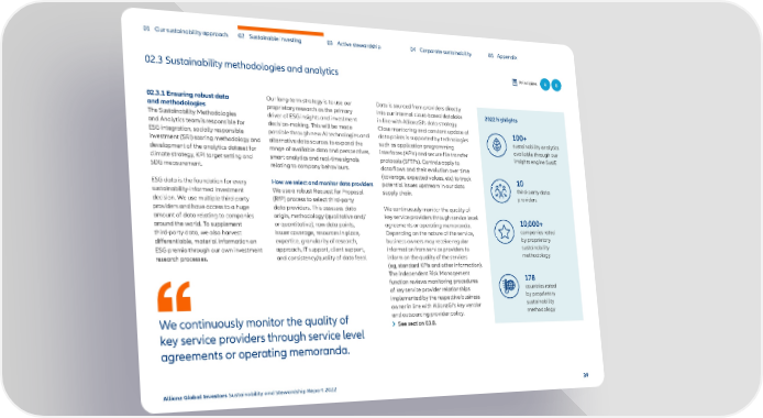01 Our sustainability approach 02 Sustainable investing 03 Active stewardship 04 Corporate sustainability 05 Appendix 02.3 Sustainability methodologies and analytics Principles 4 8 02.3.1 Ensuring robust data Our long-term strategy is to use our Data is sourced from providers directly and methodologies proprietary research as the primary into our internal cloud-based datalake 2022 highlights The Sustainability Methodologies driver of ESG insights and investment in line with AllianzGI’s data strategy. and Analytics team is responsible for decision-making. This will be made Close monitoring and constant update of 100+ ESG integration, socially responsible possible through new AI technologies and data points is supported by technologies sustainability analytics investment (SRI) scoring methodology and alternative data sources to expand the such as application programming available through our development of the analytics dataset for range of available data and perspectives, interfaces (APIs) and secure file transfer insights engine SusIE climate strategy, KPI target setting and smart analytics and real-time signals protocols (SFTPs). Controls apply to SDG measurement. relating to company behaviours. data flows and their evolution over time (coverage, expected values, etc) to track 10 ESG data is the foundation for every How we select and monitor data providers potential issues upstream in our data third-party data sustainability-informed investment We use a robust Request for Proposal supply chain. providers decision. We use multiple third-party (RfP) process to select third-party providers and have access to a huge data providers. This assesses data We continuously monitor the quality of amount of data relating to companies origin, methodology (qualitative and/ key service providers through service level 10,000+ around the world. To supplement or quantitative), raw data points, agreements or operating memoranda. third-party data, we also harvest issuer coverage, resources in place, Depending on the nature of the service, companies rated differentiable, material information on expertise, granularity of research, business owners may receive regular by proprietary ESG premia through our own investment approach, IT support, client support, information from service providers to sustainability research processes. and consistency/quality of data feed. inform on the quality of the services methodology (eg, standard KPIs and other information). The independent Risk Management 178 function reviews monitoring procedures of key service provider relationships countries rated implemented by the respective business by proprietary owner in line with AllianzGI’s key vendor sustainability We continuously monitor the quality of and outsourcing provider policy. methodology See section 03.8. key service providers through service level agreements or operating memoranda. Allianz Global Investors Sustainability and Stewardship Report 2022 39