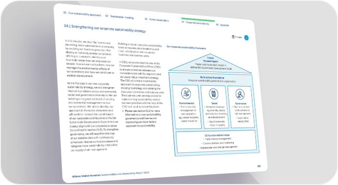 01 Our sustainability approach 02 Sustainable investing 03 Active stewardship 04 Corporate sustainability 05 Appendix 04.1 Strengthening our corporate sustainability strategy Principle 1 In this chapter, we describe how we are Building a robust corporate sustainability Our corporate sustainability framework becoming more sustainable as a company function requires clear leadership and by evolving our business processes that close collaboration with corporate directly or indirectly enable our product functions and business units. Create offering to customers. We focus on focused impact four main areas: how we empower our In 2022, we established the role of the Foster positive societal impact in people, how we run our business, how we Corporate Sustainability Officer (CSO) defined UN Sustainable Development Goals manage the environmental effects of to ensure coherence between our our operations and how we contribute to corporate sustainability approach and Build strong foundations societal development. our sustainable investment strategy. Integrate sustainability practices into organisation The CSO will drive a more holistic As the first step in our new corporate approach to corporate sustainability, sustainability strategy, we will strengthen shaping its strategy and advising the internal foundations across environmental, Executive Committee and business units. social and governance dimensions. We are The business units are responsible for building on a good standard of existing implementing sustainability-related environmental management across business practices with the help of the Environmental Social Governance our operations. We aim to develop our CSO and local sustainability leads. • Environmental • Attractive employer: • Business conduct approach in the social dimension and Please see section 01.2 for more management in eg, diversity, equity and operational will work to increase the social impact information on our sustainability own operation: and inclusion, learning risk management of our corporate contributions to the UN governance and how we are eg, carbon footprint, and development • Sustainable Sustainable Development Goals that most expanding our more holistic waste reduction • Good corporate supply chain closely align with our corporate purpose approach to sustainability. citizen in society (as outlined in section 04.5). To strengthen governance, we will reconfirm the trust of our stakeholders with continuously CS function-related areas enhanced internal control processes and • Performance management integrate more sustainability criteria into • Communications and marketing our supply chain management. • Stakeholder and change management Allianz Global Investors Sustainability and Stewardship Report 2022 101