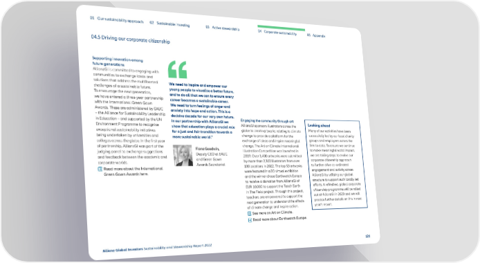 01 Our sustainability approach 02 Sustainable investing 03 Active stewardship 04 Corporate sustainability 05 Appendix 04.5 Driving our corporate citizenship Supporting innovation among future generations AllianzGI is committed to engaging with communities to exchange ideas and solutions that address the multifaceted We need to inspire and empower our challenges of a sustainable future. young people to visualise a better future, To encourage the next generation, and to do all that we can to ensure every we have entered a three-year partnership career becomes a sustainable career. with the International Green Gown We need to turn feelings of anger and Awards. These are administered by EAUC anxiety into hope and action. This is a –the Alliance for Sustainability Leadership decisive decade for our very own future. in Education – and supported by the UN In our partnership with AllianzGI we Engaging the community through art Looking ahead Environment Programme to recognise show that education plays a crucial role AllianzGI sponsors illustrators across the exceptional sustainability initiatives for a just and fair transition towards a globe to create artworks relating to climate Many of our activities have been being undertaken by universities and more sustainable world.” change to provide a platform for the successfully led by our local charity colleges across the globe. In the first year exchange of ideas and inspire meaningful groups and employees across the of partnership, AllianzGI was part of the change. The Art on Climate International firm to date. To ensure we continue judging panel to exchange suggestions Fiona Goodwin, Illustration Competition was launched in to make meaningful social impact, and feedback between the academic and Deputy CEO at EAUC 2019. Over 3,400 artworks were submitted we are taking steps to evolve our corporate worlds. and Green Gown by more than 2,300 illustrators from over corporate citizenship approach Read more about the International Awards Secretariat 100 locations in 2022. The top 53 artworks to further drive co-ordinated Green Gown Awards here. were featured in a 3D virtual exhibition engagement and activity across and the winner chose Earthwatch Europe AllianzGI by utilising our global to receive a donation from AllianzGI of structure to support such locally led EUR 10,000 to support the Teach Earth efforts. A refreshed, global corporate In The Field project. Through this project, citizenship programme will be rolled teachers are empowered to support the out at AllianzGI in 2023 and we will next generation to understand the effects provide further details on this in next of climate change and inspire action. year’s report. See more on Art on Climate. Read more about Earthwatch Europe. Allianz Global Investors Sustainability and Stewardship Report 2022 121
