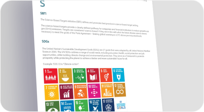 S SBTi The Science-Based Targets initiative (SBTi) defines and promotes best practice in science-based target setting. The science-based targets provide a clearly defined pathway for companies and financial institutions to reduce greenhouse gas (GHG) emissions. Targets are considered ‘science-based’ if they are in line with what the latest climate science deems necessary to meet the goals of the Paris Agreement – limiting global warming to 1.5°C above pre-industrial levels. SDGs The United Nation’s Sustainable Development Goals (SDGs) are 17 goals that were adopted by all United Nations Member States in 2015. The UN SDGs address a range of social needs, including education, health, social protection and job opportunities, while tackling climate change and environmental protection. They serve as a framework to promote prosperity while protecting the planet to achieve a better and more sustainable future for all. Example: SDG 13 is “Climate action”. Allianz Global Investors supports the UN Sustainable Development Goals (SDGs). Market terminology AllianzGI Sustainable Investing – Glossary 15