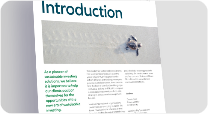 Introduction The market for sustainable investments has seen significant growth over the years which in turn has produced a raft of different terminology, acronyms, processes and standards. Investors can find the lack of standardised language confusing, making it difficult to compare sustainable investment products and strategies across asset management houses. Various international organisations and initiatives are trying to tackle this issue, however in the interim it leaves investors wading through the terminology swamp. This glossary is designed to As a pioneer of sustainable investing solutions, we believe it is important to help our clients position themselves for the opportunities of the new era of sustainable investing. provide clarity on our approach by explaining the most common terms and key concepts that we at Allianz Global Investors use within our communications to you. Authors Dennis Baas Adrien Vannier Jonathan Ho Sustainability Specialists at Allianz Global Investors AllianzGI Sustainable Investing – Glossary 3