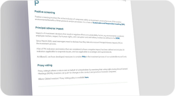 P Positive screening Positive screening involves the active inclusion of companies within an investment universe because of the social or environmental benefits of their products and/or processes. It is a form of Sustainable and Responsible Investing (SRI) . Principal adverse impact Impacts of investment decisions that result in negative effects on sustainability factors, eg, environmental, social and employee matters, respect for human rights, anti-corruption and anti-bribery matters (as defined in the SFDR ). Since March 2021, asset managers need to disclose how they take into account Principal Adverse Impacts (PAI) in the investment process. A list of PAI indicators and metrics that are considered to have a negative impact has been defined and includes 14 indicators applicable to corporate issuers, and two applicable to sovereigns and supranationals. At AllianzGI, we have developed measures to consider PAIs in the investment process of our sustainable mutual funds. Proxy voting Proxy voting is where a vote is cast on behalf of a shareholder. By exercising their voting rights during Annual General Meetings (AGMs), investors can push for changes in the conduct and practice of investee companies. Allianz Global Investors’ Proxy Voting policy is available here . Market terminology AllianzGI Sustainable Investing – Glossary 14