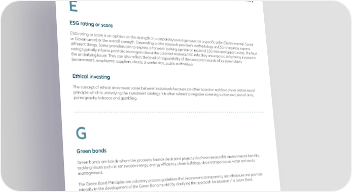 Market terminology E ESG rating or score ESG rating or score is an opinion on the strength of a corporate/sovereign issuer on a specific pillar (Environmental, Social or Governance) or the overall strength. Depending on the research provider’s methodology an ESG rating may express different things. Some providers aim to express a forward-looking opinion on material ESG risks and opportunities. The final rating typically informs portfolio managers about the potential material ESG risks they are exposed to by being invested in the underlying issuer. They can also reflect the level of responsibility of the company towards all its stakeholders (environment, employees, suppliers, clients, shareholders, public authorities). Ethical investing The concept of ethical investment varies between individuals because it is often based on a philosophy or certain moral principle which is underlying the investment strategy. It is often related to negative screening such as exclusion of arms, pornography, tobacco and gambling. G Green bonds Green bonds are bonds where the proceeds finance dedicated projects that have measurable environmental benefits, tackling issues such as: renewable energy, energy efficiency, clean buildings, clean transportation, water and waste management. The Green Bond Principles are voluntary process guidelines that recommend transparency and disclosure and promote integrity in the development of the Green Bond market by clarifying the approach for issuance of a Green Bond. AllianzGI Sustainable Investing – Glossary 9