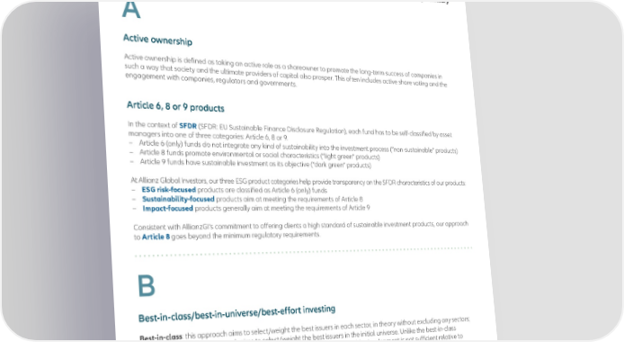 Market terminology A Active ownership Active ownership is defined as taking an active role as a shareowner to promote the long-term success of companies in such a way that society and the ultimate providers of capital also prosper. This often includes active share voting and the engagement with companies, regulators and governments. Article 6, 8 or 9 products In the context of SFDR (SFDR: EU Sustainable Finance Disclosure Regulation), each fund has to be self-classified by asset managers into one of three categories: Article 6, 8 or 9. – Article 6 (only) funds do not integrate any kind of sustainability into the investment process (“non-sustainable” products) – Article 8 funds promote environmental or social characteristics (“light green” products) – Article 9 funds have sustainable investment as its objective (“dark green” products) At Allianz Global Investors, our three ESG product categories help provide transparency on the SFDR characteristics of our products: – ESG risk-focused products are classified as Article 6 (only) funds – Sustainability-focused products aim at meeting the requirements of Article 8 – Impact-focused products generally aim at meeting the requirements of Article 9 Consistent with AllianzGI’s commitment to offering clients a high standard of sustainable investment products, our approach to Article 8 goes beyond the minimum regulatory requirements. B Best-in-class/best-in-universe/best-effort investing Best-in-class : this approach aims to select/weight the best issuers in each sector, in theory without excluding any sectors; Best-in-universe : this approach aims to select/weight the best issuers in the initial universe. Unlike the best-in-class approach, certain sectors may be excluded if their contribution to sustainable development is not sufficient relative to issuers in other sectors represented in the initial universe; AllianzGI Sustainable Investing – Glossary 5