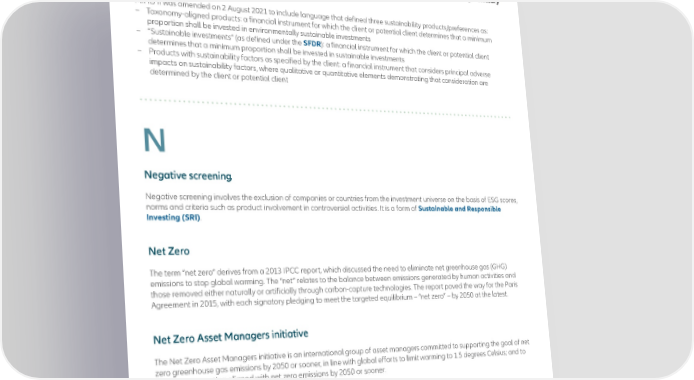 MIFID II was amended on 2 August 2021 to include language that defined three sustainability products/preferences as: – Taxonomy-aligned products: a financial instrument for which the client or potential client determines that a minimum proportion shall be invested in environmentally sustainable investments – “Sustainable investments” (as defined under the SFDR ): a financial instrument for which the client or potential client determines that a minimum proportion shall be invested in sustainable investments – Products with sustainability factors as specified by the client: a financial instrument that considers principal adverse impacts on sustainability factors, where qualitative or quantitative elements demonstrating that consideration are determined by the client or potential client N Negative screening Negative screening involves the exclusion of companies or countries from the investment universe on the basis of ESG scores, norms and criteria such as product involvement in controversial activities. It is a form of Sustainable and Responsible Investing (SRI) . Net Zero The term “net zero” derives from a 2013 IPCC report, which discussed the need to eliminate net greenhouse gas (GHG) emissions to stop global warming. The “net” relates to the balance between emissions generated by human activities and those removed either naturally or artificially through carbon-capture technologies. The report paved the way for the Paris Agreement in 2015, with each signatory pledging to meet the targeted equilibrium – “net zero” – by 2050 at the latest. Net Zero Asset Managers initiative The Net Zero Asset Managers initiative is an international group of asset managers committed to supporting the goal of net zero greenhouse gas emissions by 2050 or sooner, in line with global efforts to limit warming to 1.5 degrees Celsius; and to supporting investing aligned with net zero emissions by 2050 or sooner. Market terminology AllianzGI Sustainable Investing – Glossary 12