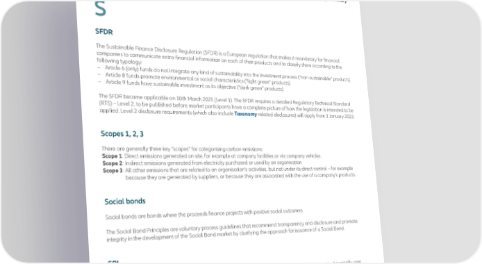 S SFDR The Sustainable Finance Disclosure Regulation (SFDR) is a European regulation that makes it mandatory for financial companies to communicate extra-financial information on each of their products and to classify them according to the following typology: – Article 6 (only) funds do not integrate any kind of sustainability into the investment process (“non-sustainable” products) – Article 8 funds promote environmental or social characteristics (“light green” products) – Article 9 funds have sustainable investment as its objective (“dark green” products) The SFDR became applicable on 10th March 2021 (Level 1). The SFDR requires a detailed Regulatory Technical Standard (RTS) – Level 2, to be published before market participants have a complete picture of how the legislation is intended to be applied. Level 2 disclosure requirements (which also include Taxonomy -related disclosures) will apply from 1 January 2023. Scopes 1, 2, 3 There are generally three key “scopes” for categorising carbon emissions: Scope 1 : Direct emissions generated on site, for example at company facilities or via company vehicles. Scope 2 : Indirect emissions generated from electricity purchased or used by an organisation Scope 3 : All other emissions that are related to an organisation’s activities, but not under its direct control – for example because they are generated by suppliers, or because they are associated with the use of a company’s products. Social bonds Social bonds are bonds where the proceeds finance projects with positive social outcomes. The Social Bond Principles are voluntary process guidelines that recommend transparency and disclosure and promote integrity in the development of the Social Bond market by clarifying the approach for issuance of a Social Bond. SRI Sustainable and responsible investing (SRI), sometimes also referred to as “Socially responsible investing”, typically uses ESG factors to apply negative or positive screens on the investment universe. Market terminology AllianzGI Sustainable Investing – Glossary 16