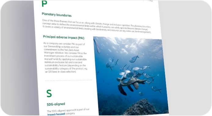 P Planetary boundaries One of the three themes that we focus on, along with climate change and inclusive capitalism. The planetary boundary concept aims to define the environmental limits within which humanity can safely operate (beyond climate change). It covers a variety of environmental limits dealing with biodiversity and resource use (eg, water use, land management). Principal adverse impact (PAI) As a company we consider PAI as part of our Stewardship activities and our commitment to the Net Zero Asset Manager Initiative. We consider PAI in the investment process of our sustainable mutual funds by applying our sustainable minimum exclusion list and a second sustainability feature (depending on the sustainability category of the product, eg, an SRI best-in-class selection). S SDG-aligned The SDG-aligned approach is part of our Impact-focused categor y. AllianzGI concepts AllianzGI Sustainable Investing – Glossary 27