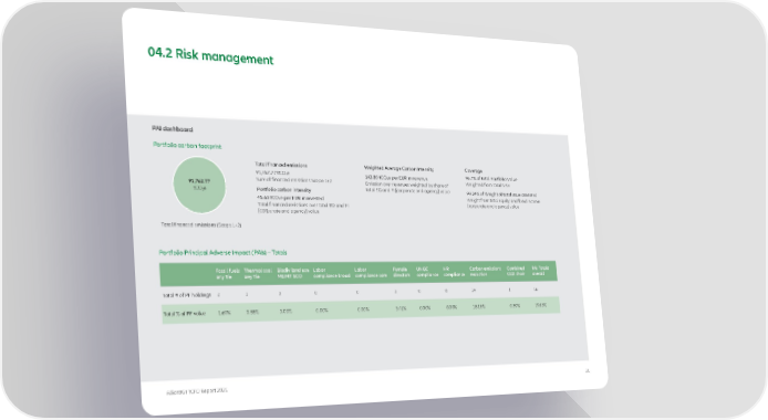 04.2 Risk management PAI dashboard Portfolio carbon footprint Total financed emissions Weighted Average Carbon Intensity Coverage 91,762.77 tCO2e 143.85 tCO2e per EUR m revenue 96.7% of total Portfolio Value 91,762.77 Sum of financed emissions Scope 1+2 Emission over revenues weighted by share of Weighted from total NAV tCO e Portfolio carbon intensity total EQ and FI [corporate and agency] value 99.24% of Weight of total issue assessed 2 45.63 tCO2e per EUR m invested Weight from total equity and fixed income Total financed emissions over total EQ and FI [corporate and agency] value [corporate and agency] value Total financed emissions (Scope 1+2) Portfolio Principal Adverse Impact (PAIs) – Totals Fossil fuels Thermal coal Biodiv land use Labor Labor Female UNGC HR Carbon emissions Combined PAI Totals any Tie any Tie MGMT SCO compliance broad compliance core directors compliance compliance reduction CEO chair overall Total # of PF holdings 2 1 0 0 0 3 0 0 14 1 16 Total % of PF value 1.69% 0.88% 0.00% 0.00% 0.00% 3.41% 0.00% 0.00% 18.18% 0.59% 19.65% AllianzGI TCFD Report 2021 21