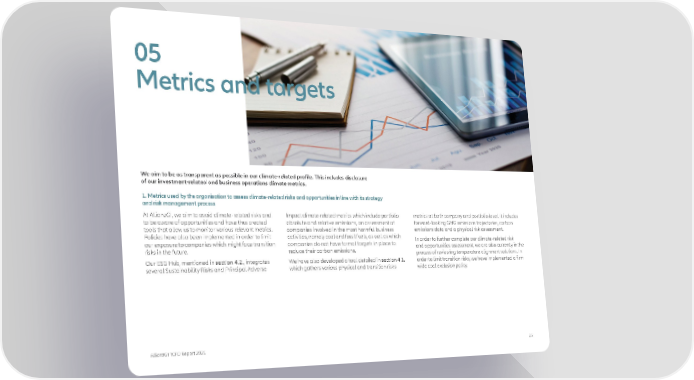 05 Metrics and targets We aim to be as transparent as possible in our climate-related profile. This includes disclosure of our investment-related and business operations climate metrics. 1. Metrics used by the organisation to assess climate-related risks and opportunities in line with its strategy and risk management process At AllianzGI, we aim to avoid climate-related risks and Impact climate-related metrics which include portfolio metrics at both company and portfolio level. It includes to be aware of opportunities and have thus created absolute and relative emissions, an assessment of forward-looking GHG emissions trajectories, carbon tools that allow us to monitor various relevant metrics. companies involved in the most harmful business emissions data and a physical risk assessment. Policies have also been implemented in order to limit activities, namely coal and fossil fuels, as well as which In order to further complete our climate-related risk our exposure to companies which might face transition companies do not have formal targets in place to and opportunities assessment, we are also currently in the risks in the future. reduce their carbon emissions. process of reviewing temperature alignment solutions. In Our ESG Hub, mentioned in section 4.2., integrates We have also developed a tool detailed in section 4.1. order to limit transition risks, we have implemented a firm several Sustainability Risks and Principal Adverse which gathers various physical and transition risks wide coal exclusion policy. AllianzGI TCFD Report 2021 25